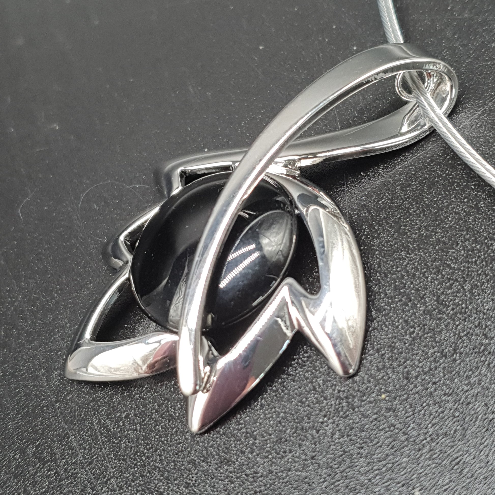 Parure collier boucles d'oreilles pendants double chaîne câble métallique argenté pendentif feuille pierre onyx oeil de chat