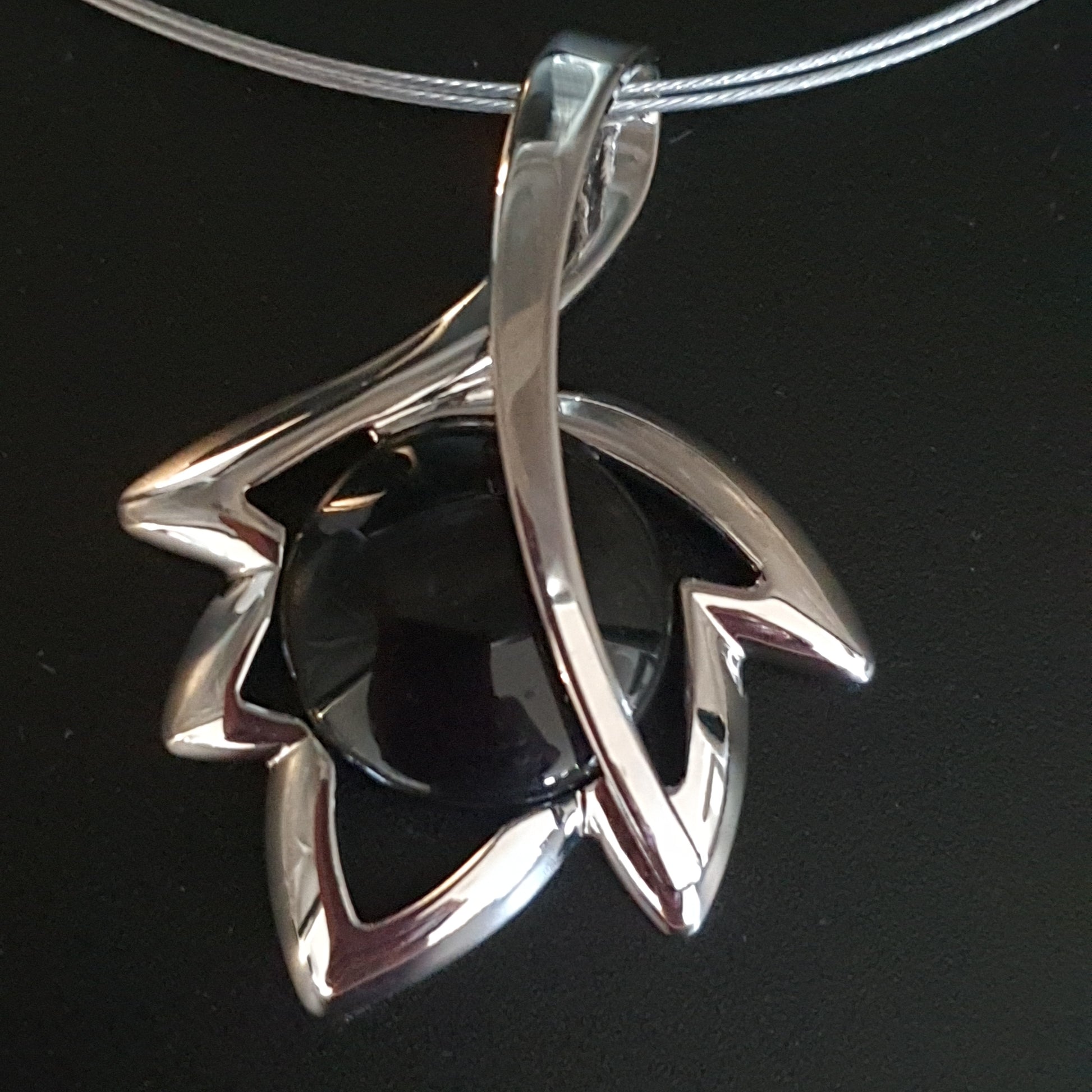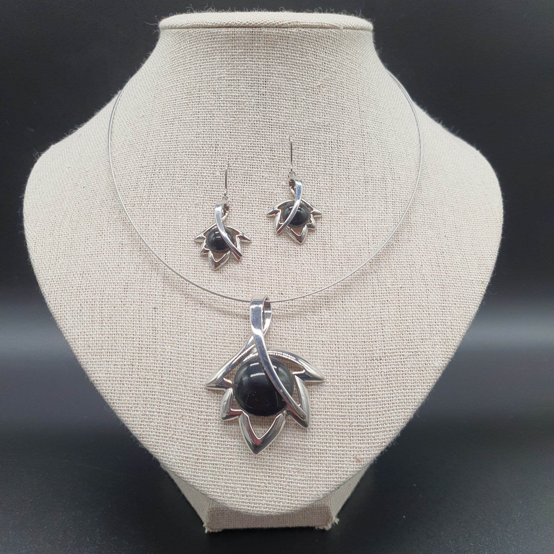 Parure collier et boucles d'oreilles pendants constituée d'une double chaîne en câble métallique argenté agrémenté d'un pendentif en forme de feuille en métal argent surmonté d'une pierre d'onyx "oeil de chat".