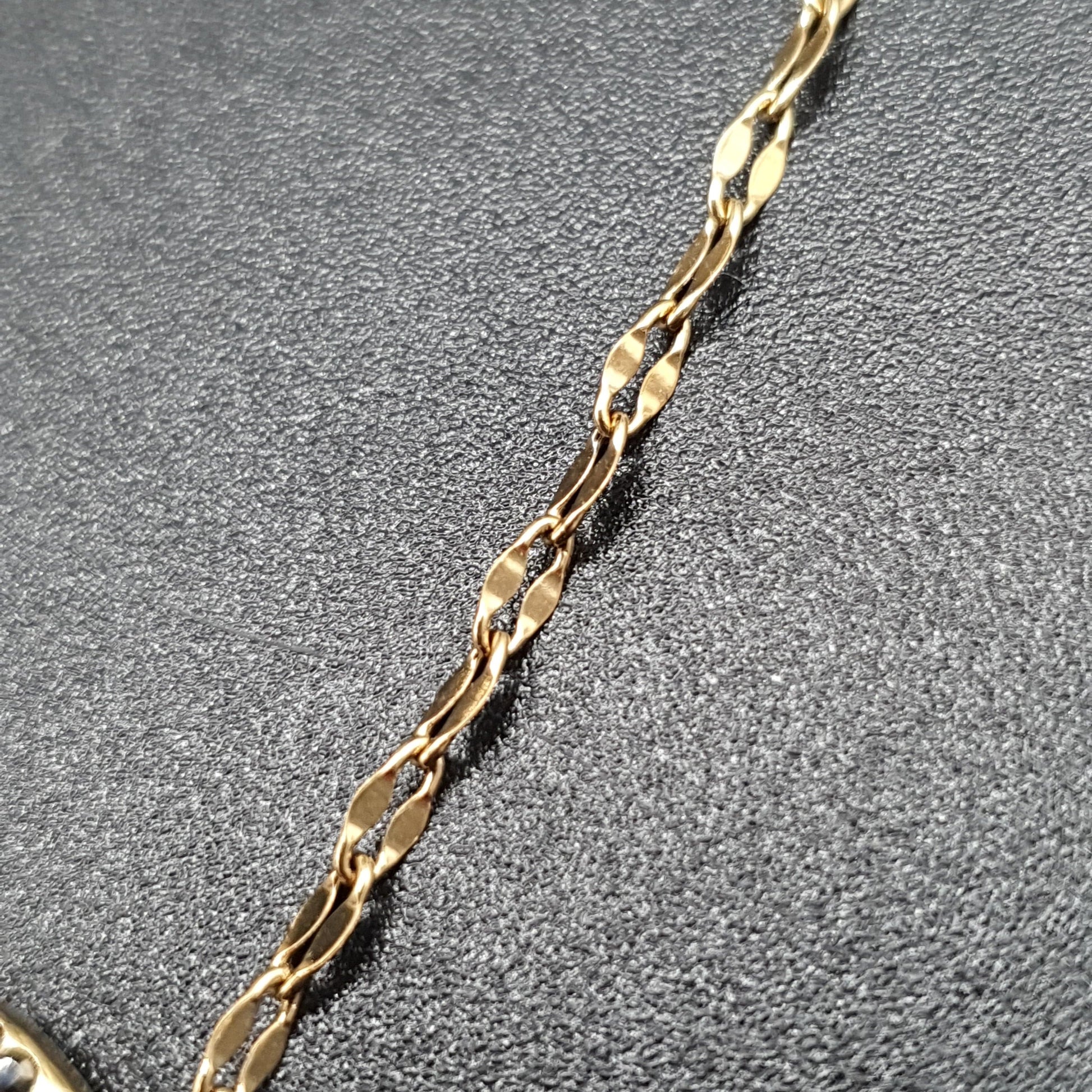 Bracelet en acier doré constitué d'une fine chaîne en maille fantaisie torsadée, agrémenté d'une pièce en métal doré surmontée de strass.