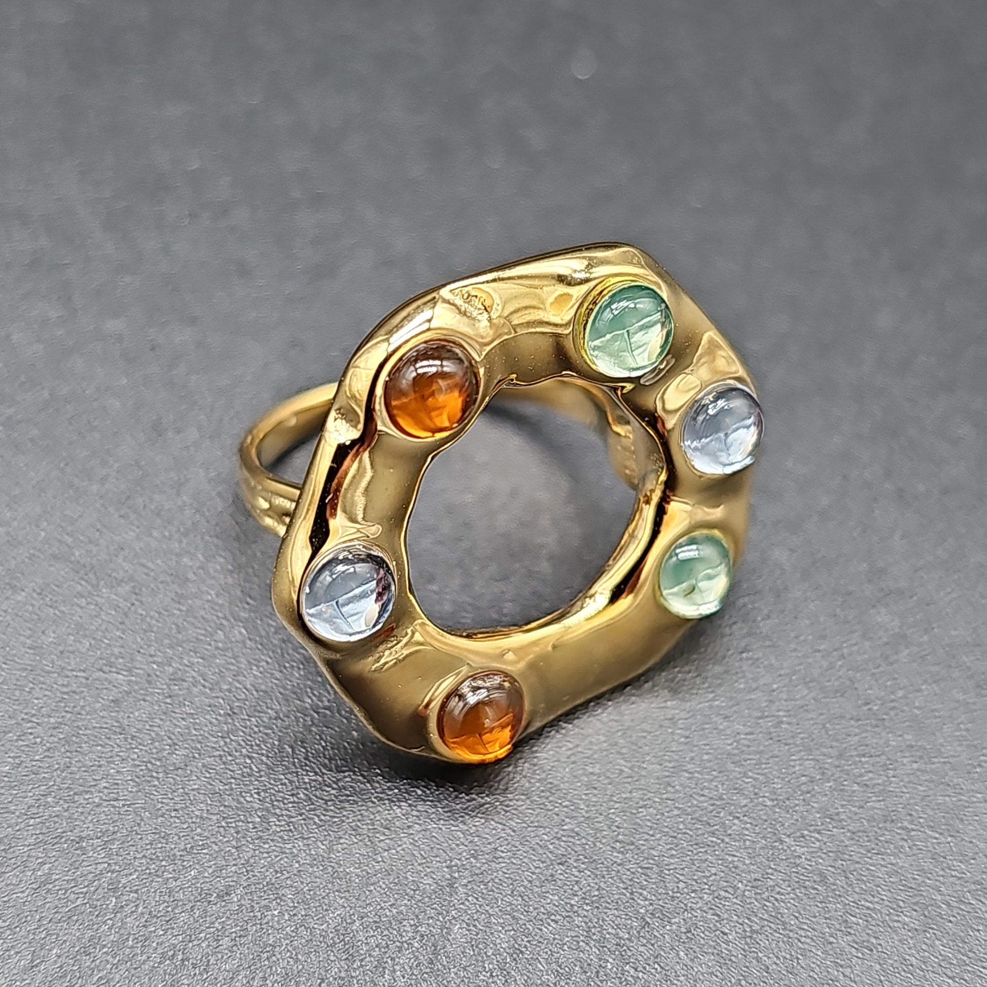 Bague anneau ouvert ajustable acier inoxydable doré cercle plat texturé incrusté cabochons multicolores