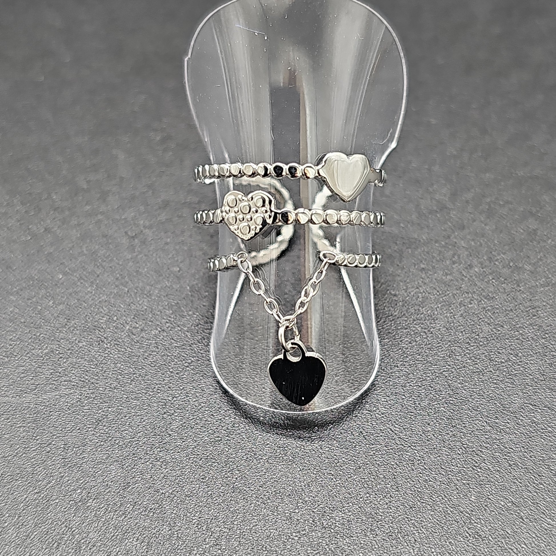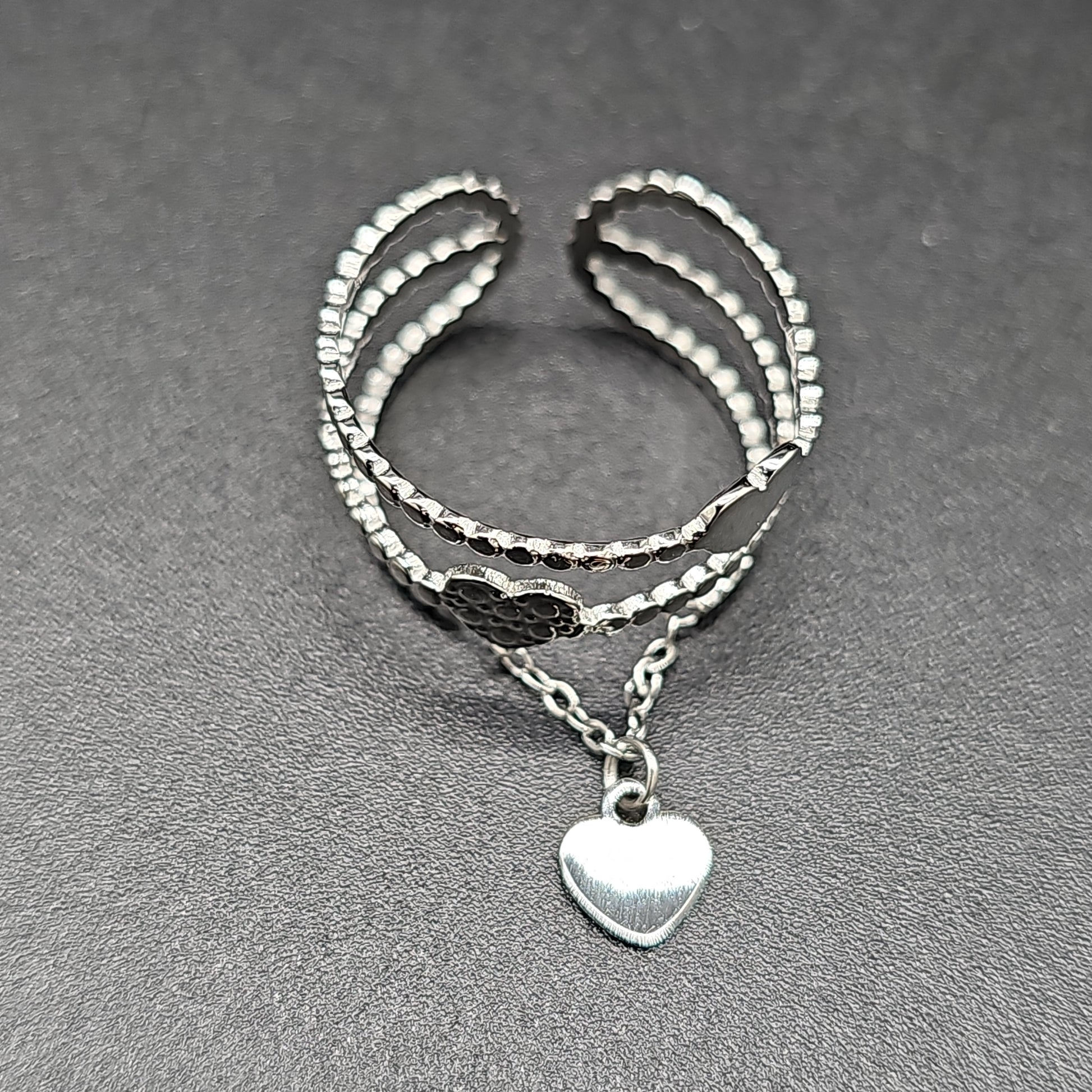 Bague triple rang ouverte ajustable composée de trois anneaux en acier inoxydable perlé, agrémentés de coeurs lisses et martelés, ainsi que d'une chaînette au bout de laquelle pend une pampille en forme de coeur.