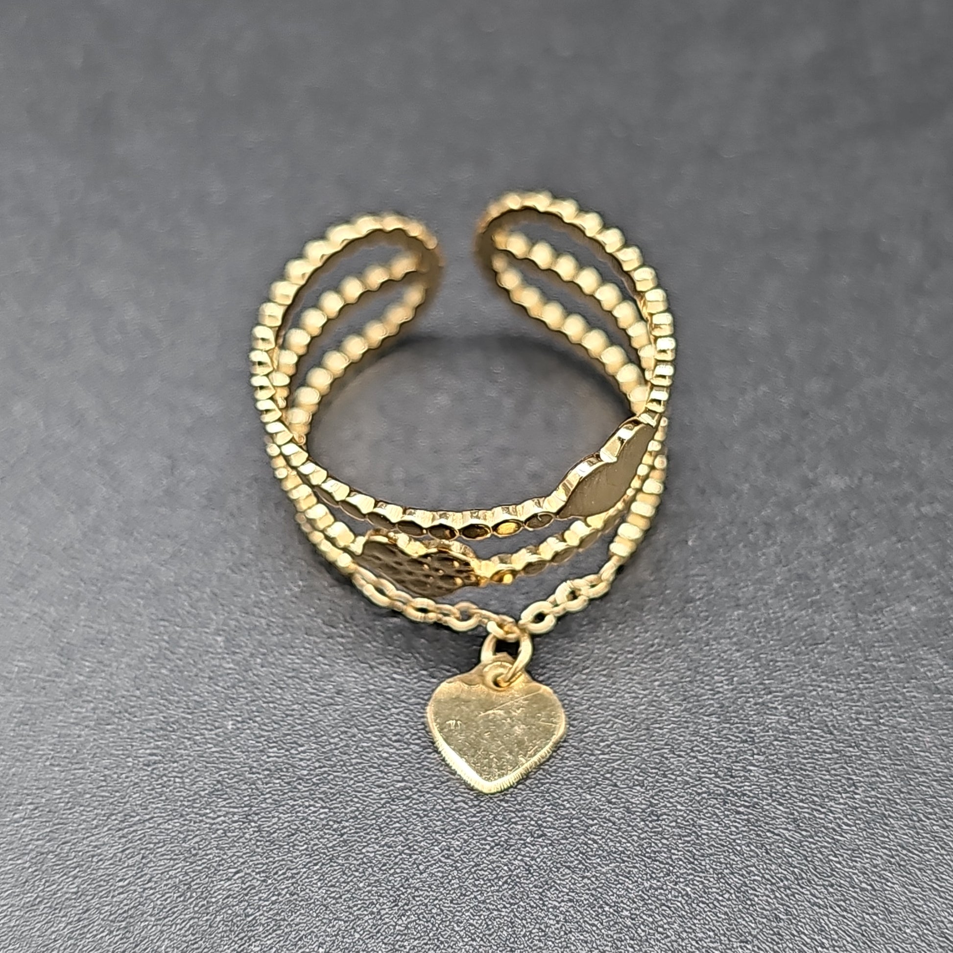 Bague triple rang ouverte ajustable trois anneaux acier inoxydable perlé doré argenté coeurs lisses martelés chaînette pampille forme coeur