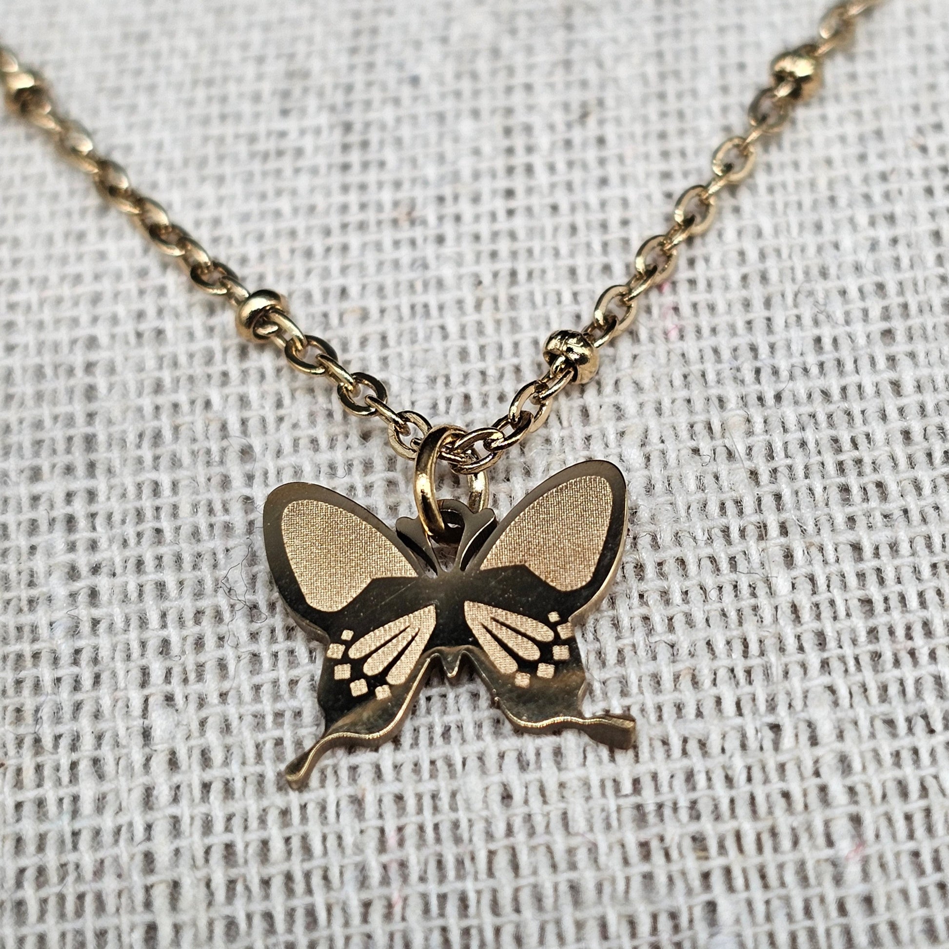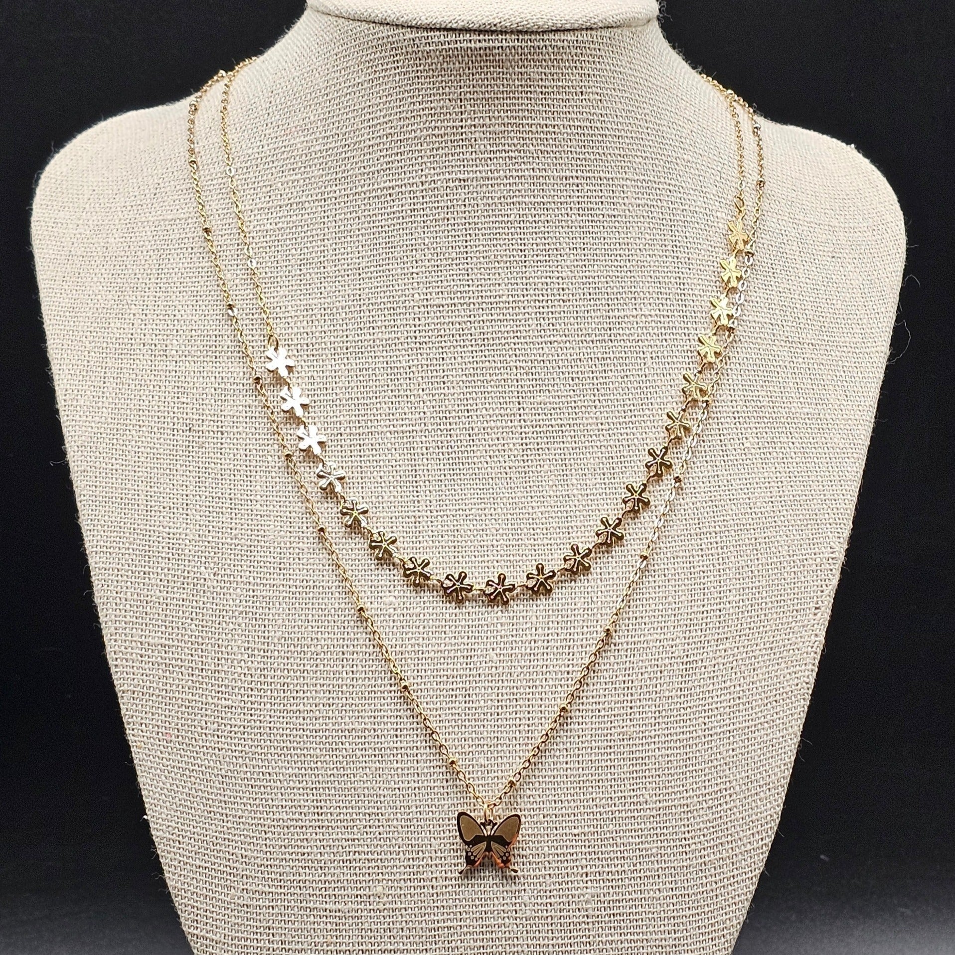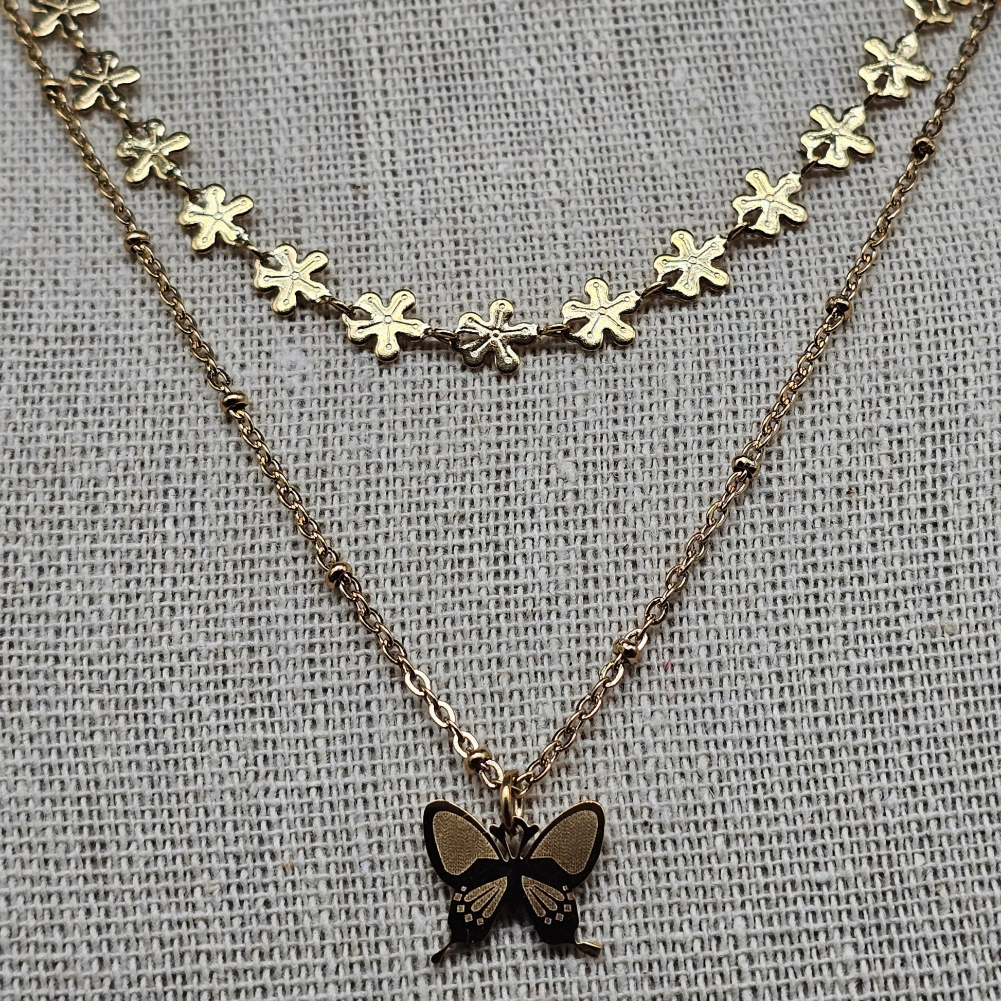 Collier sautoir double rang doré acier inoxydable – Chaînes fantaisie papillon et fleurs ciselées