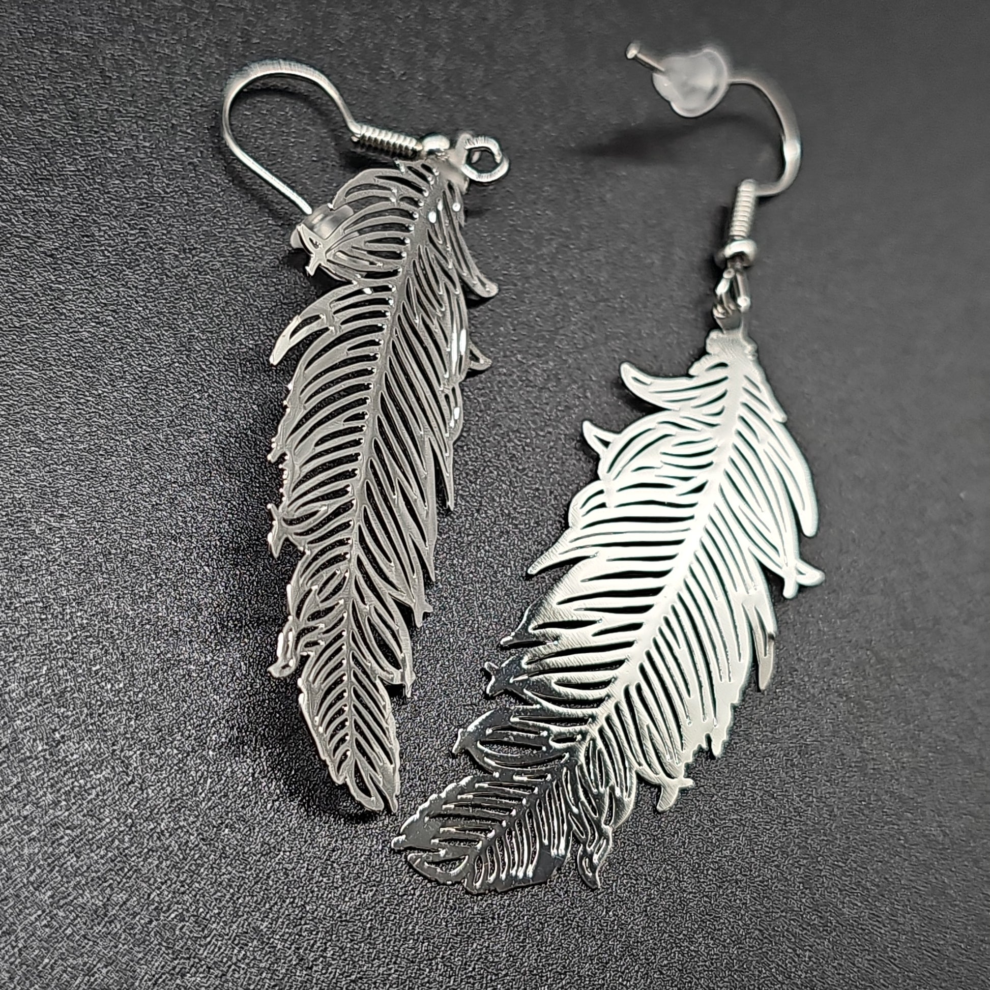 ✨ Boucles pendantes en forme de plume, en acier inoxydable texturé brillant. Légères, originales et faciles à porter au quotidien.