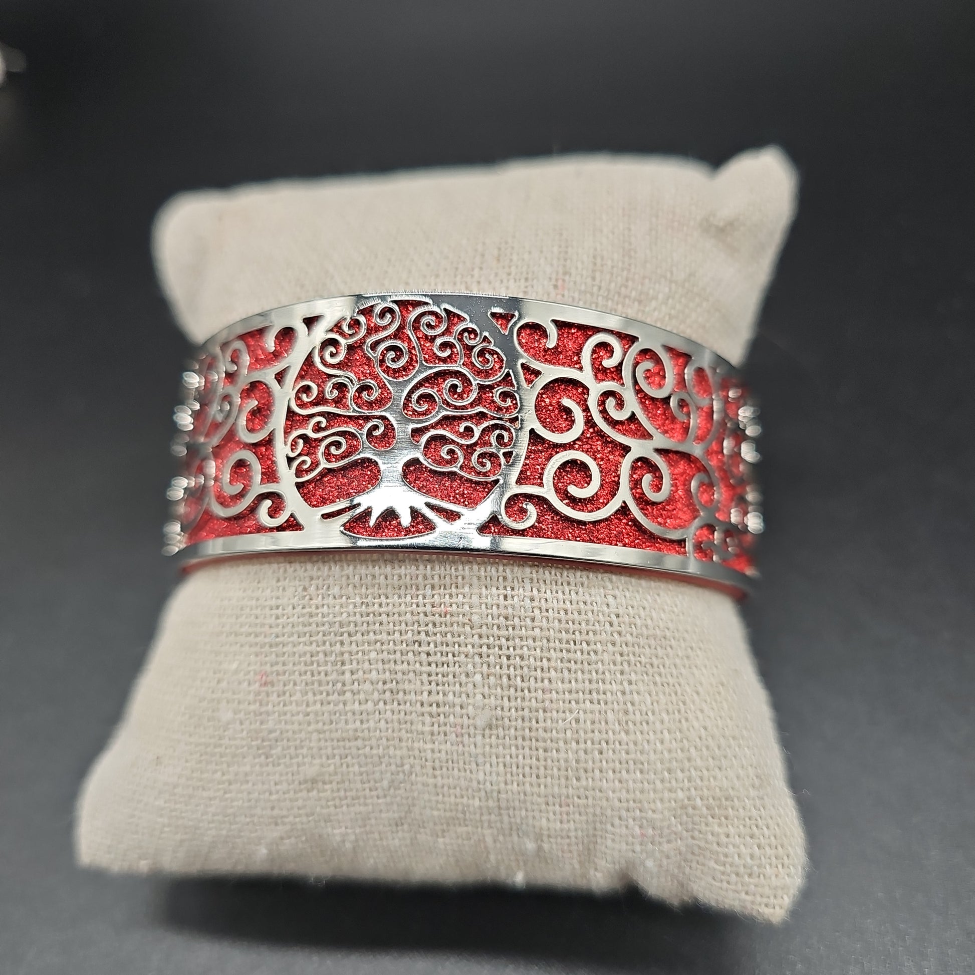 Bracelet manchette argenté arbre de vie en simili cuir coloré – acier inoxydable