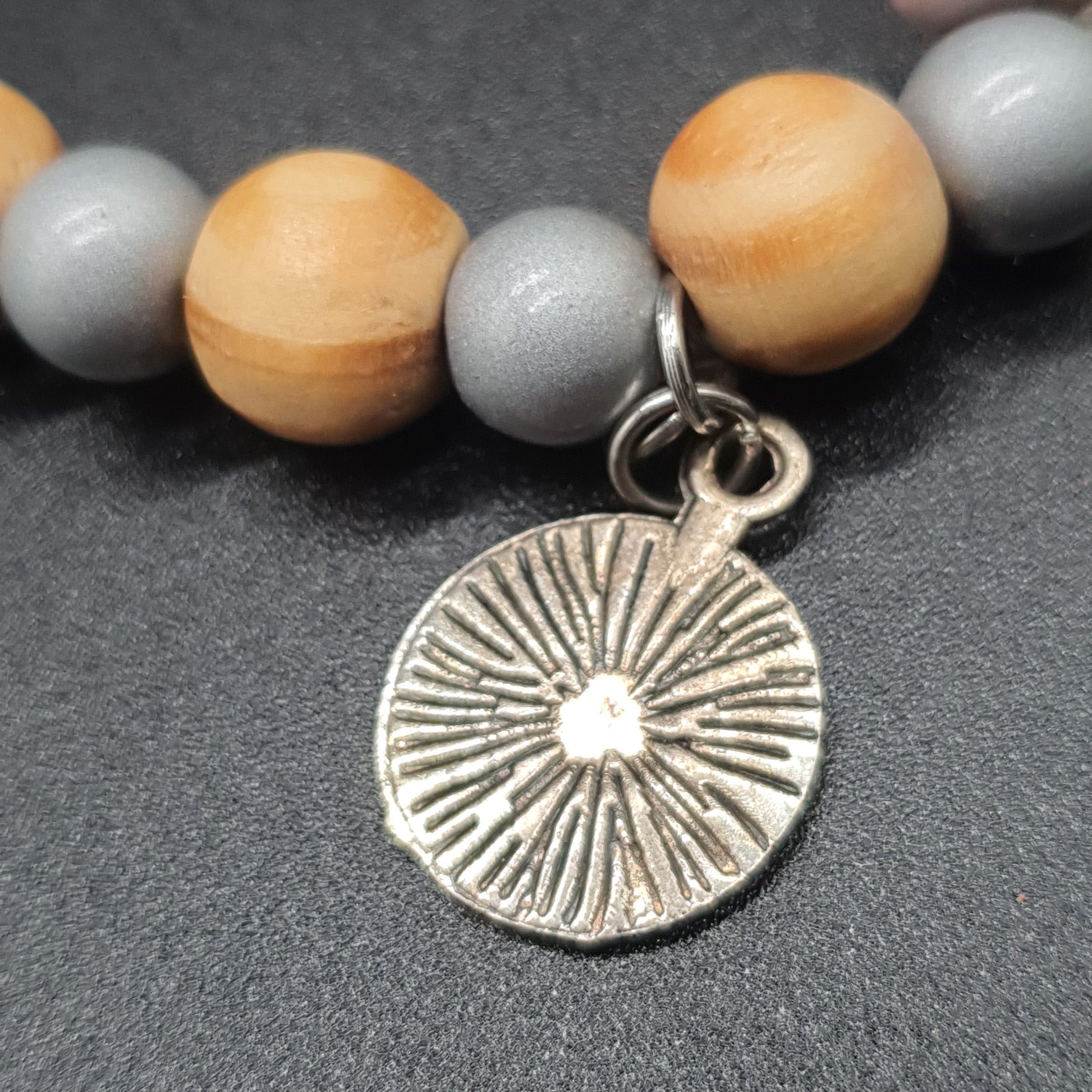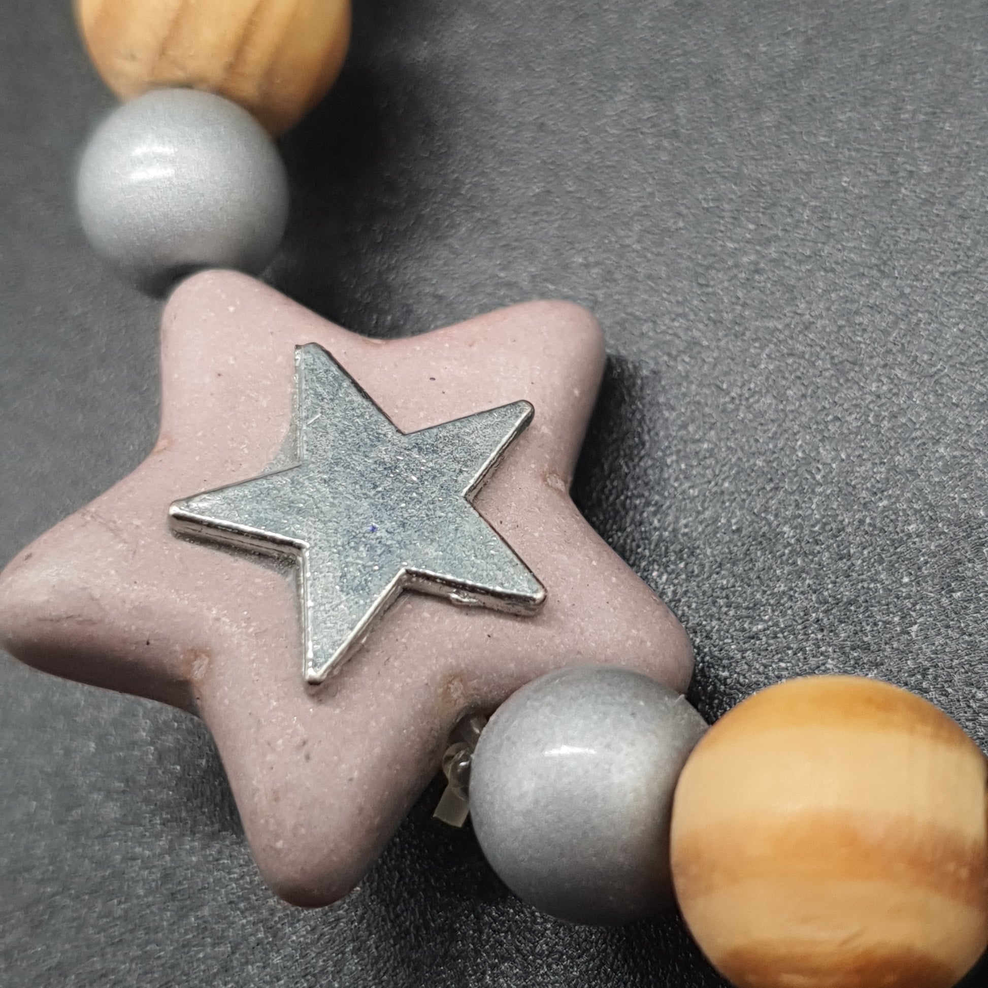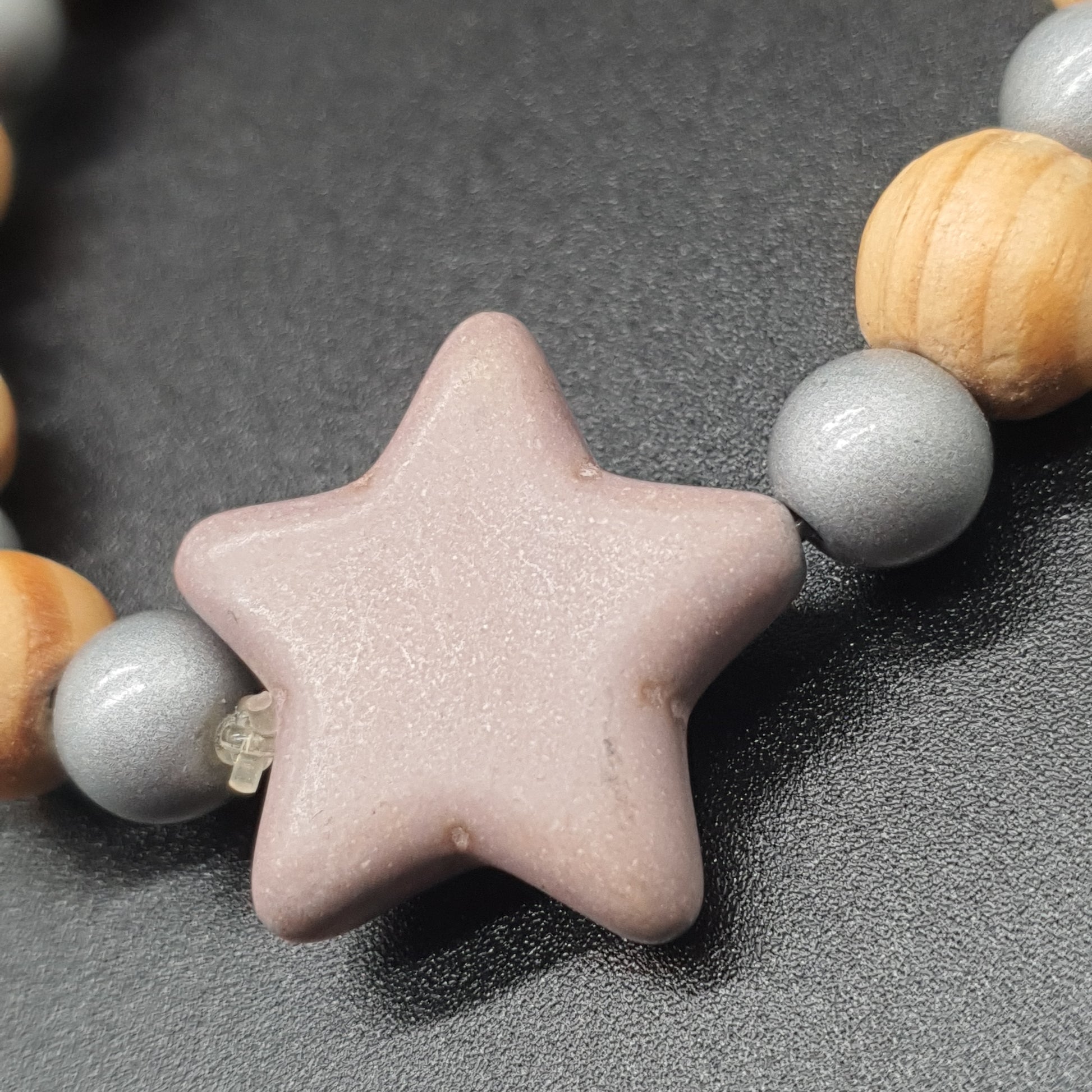 Composé de perles fantaisie en bois et pierre, il est sublimé par une pampille étoile dorée qui apporte une touche lumineuse et délicate à ton poignet.