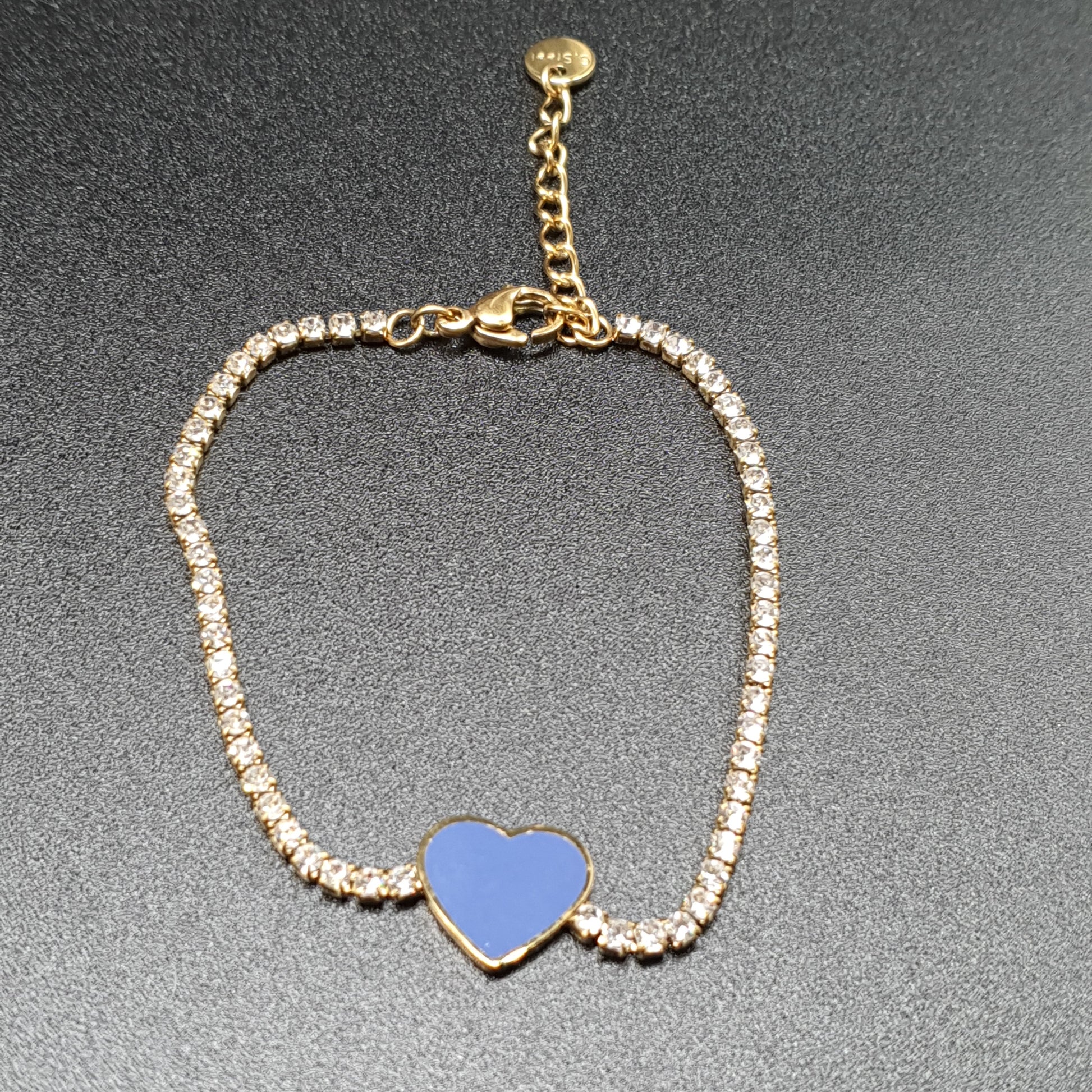 Ce bracelet en acier inoxydable doré est orné d’une chaîne maille fine sertie de strass blancs scintillants, sublimée par un pendentif en forme de cœur émaillé bleu.