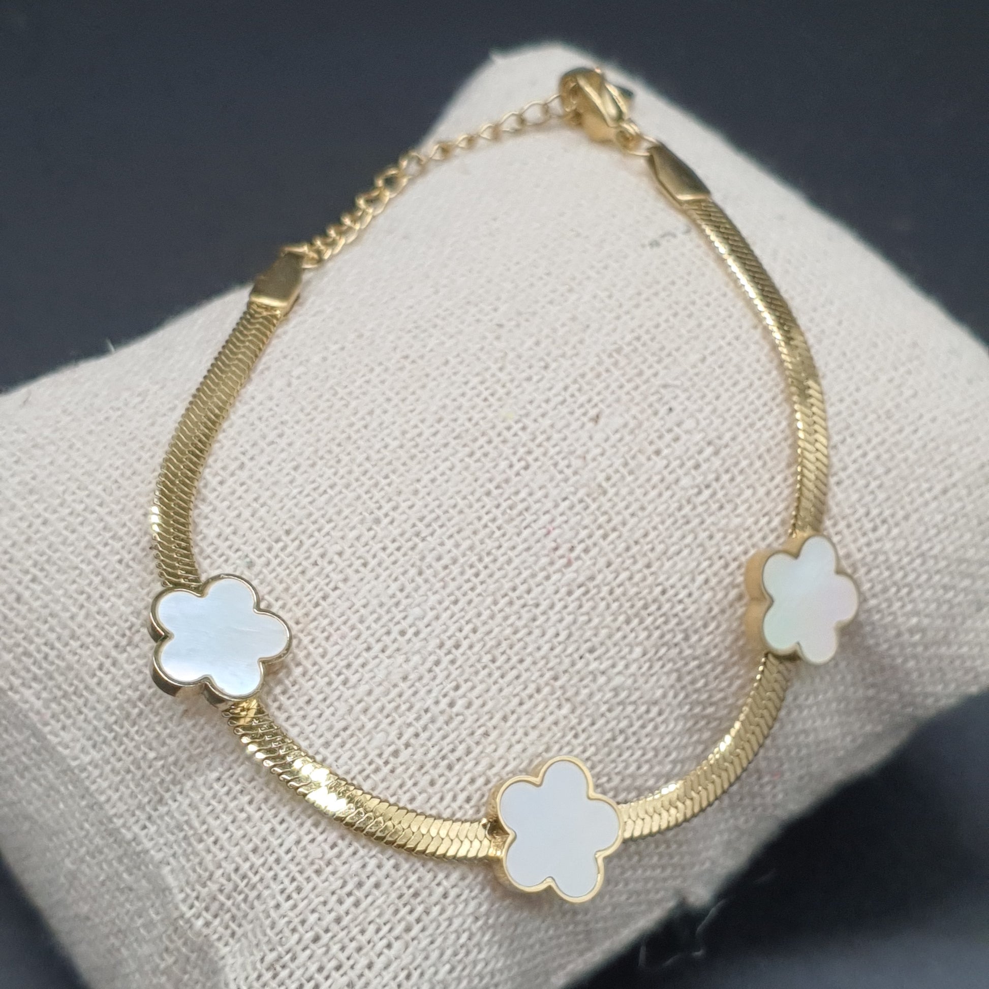 Bracelet acier inoxydable chaîne maille miroir dorée fleurs métal serties nacre