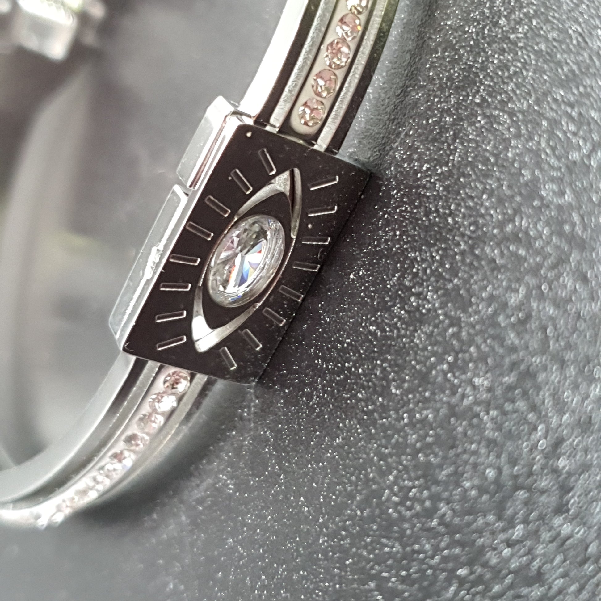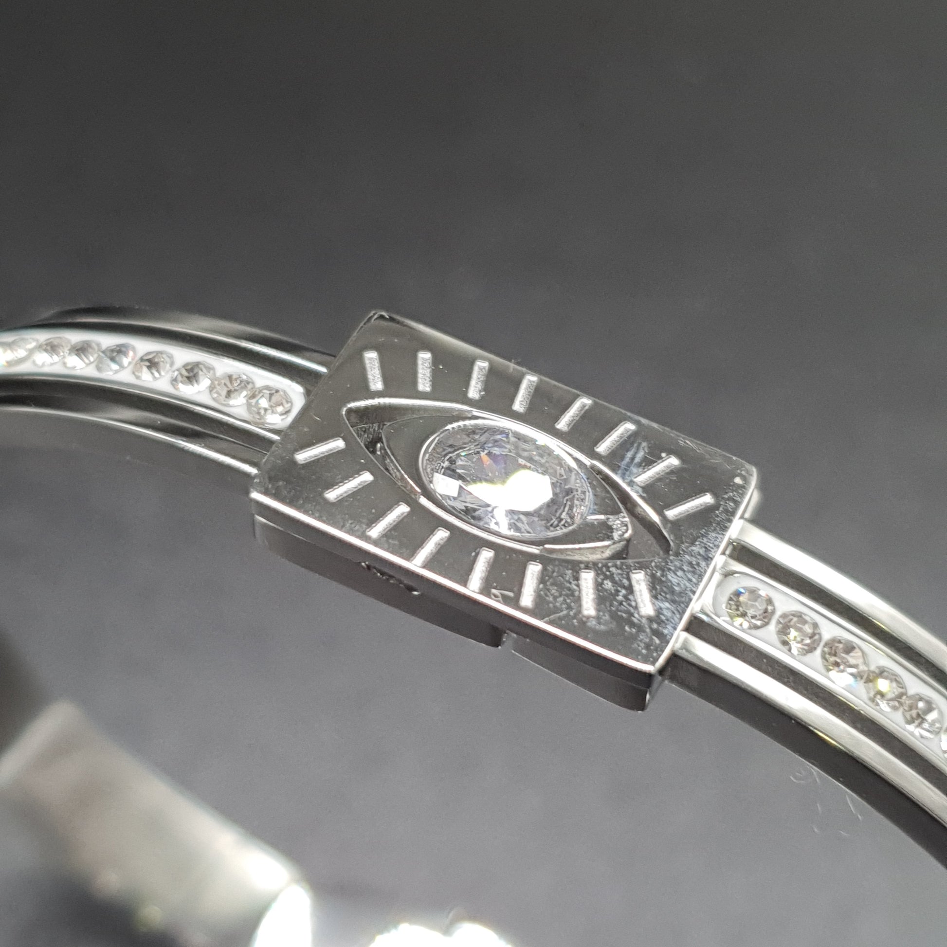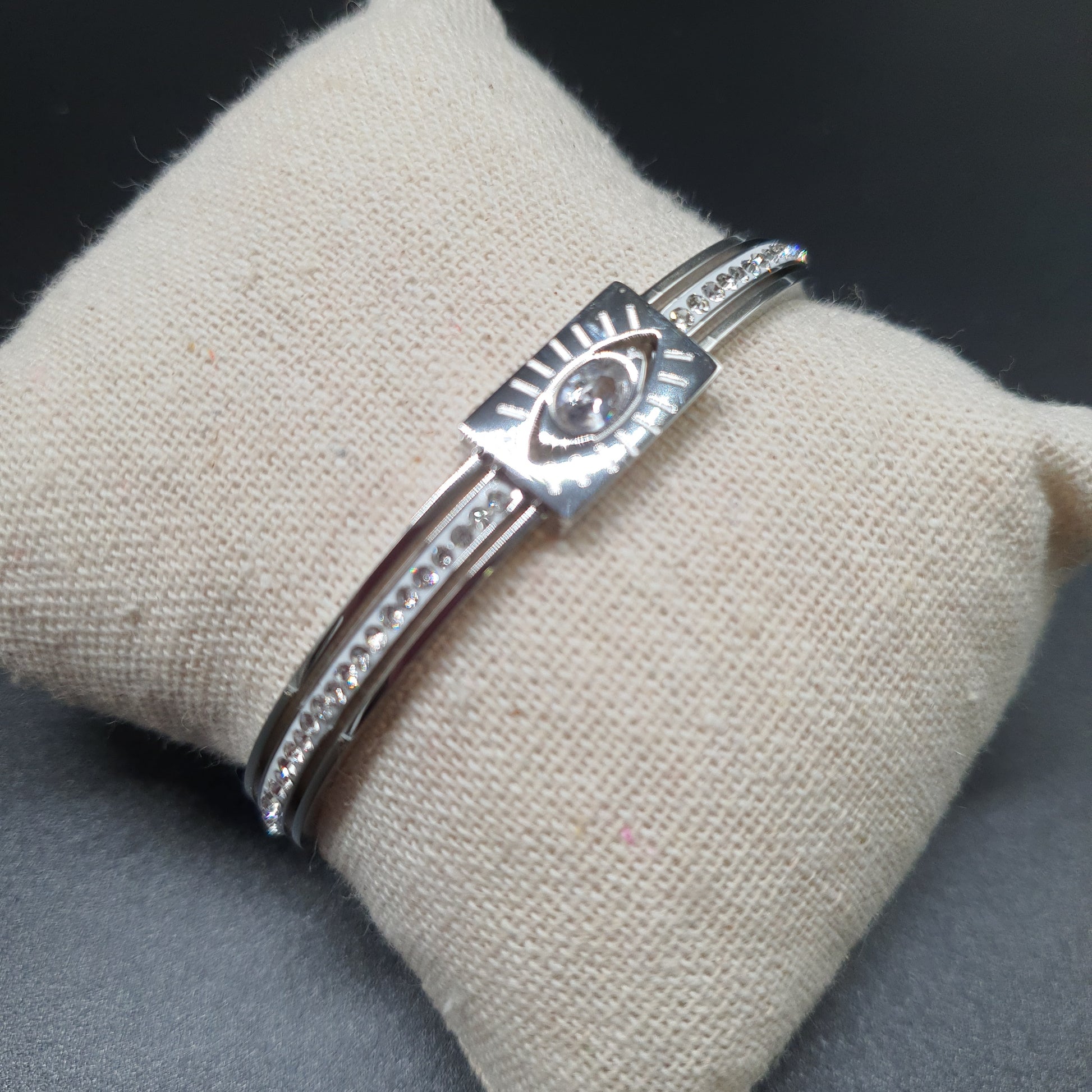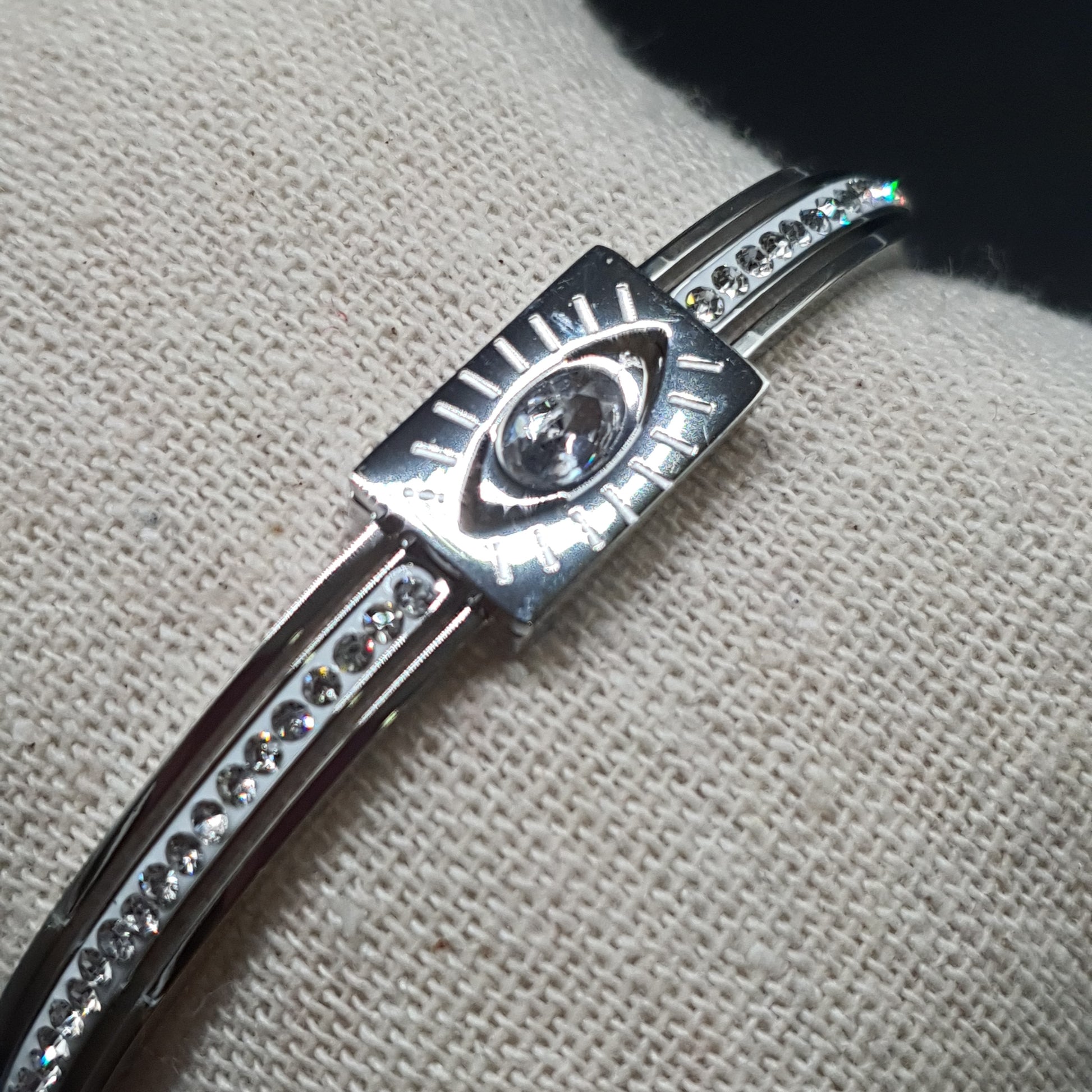 Bracelet jonc acier inoxydable argenté – œil mystique, strass et pièce rectangulaire