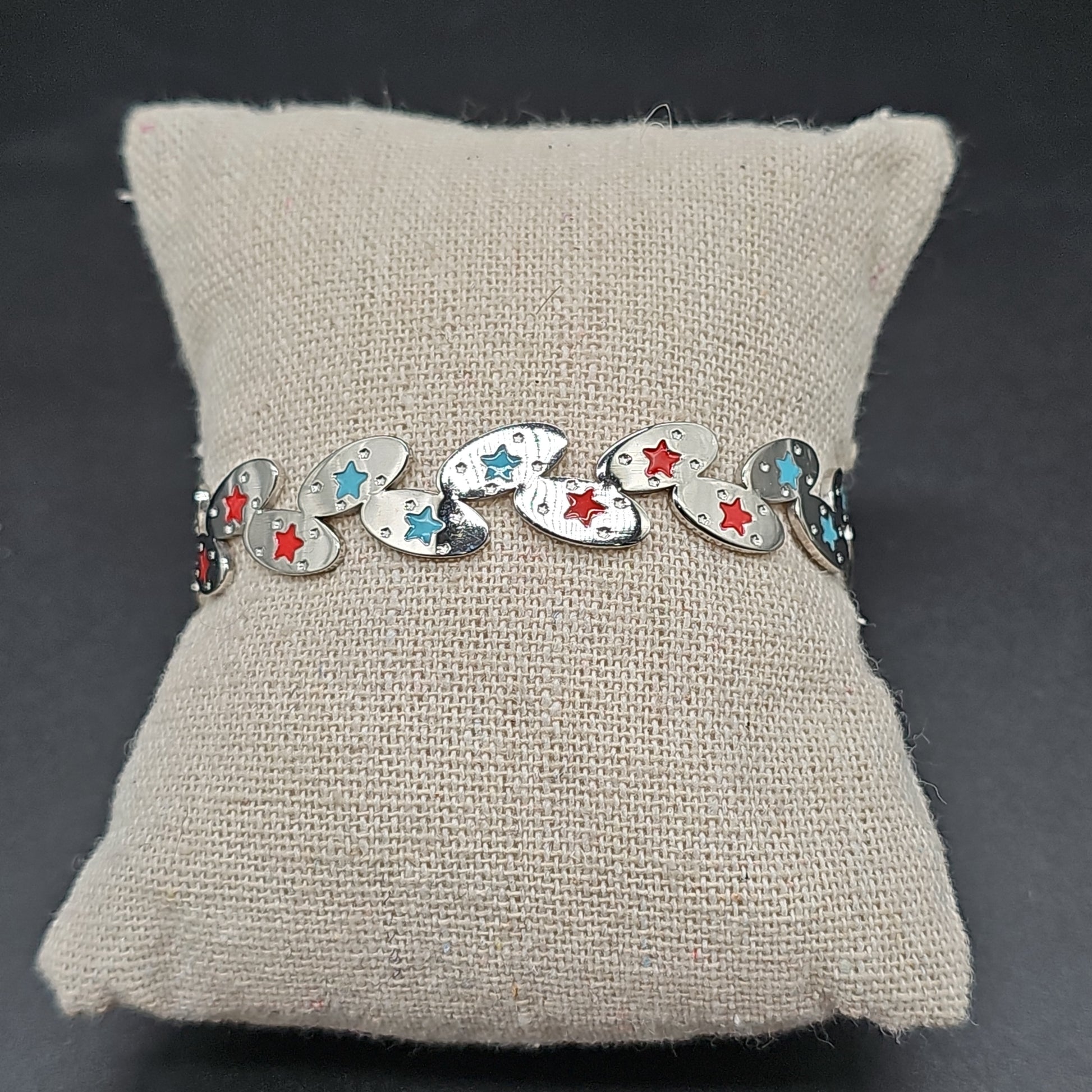 Ce bracelet jonc rigide en acier inoxydable argenté adopte une forme d’épices stylisées, ponctuées de détails colorés rouges et bleus, ainsi que de motifs étoiles incrustés pour une touche lumineuse et unique.