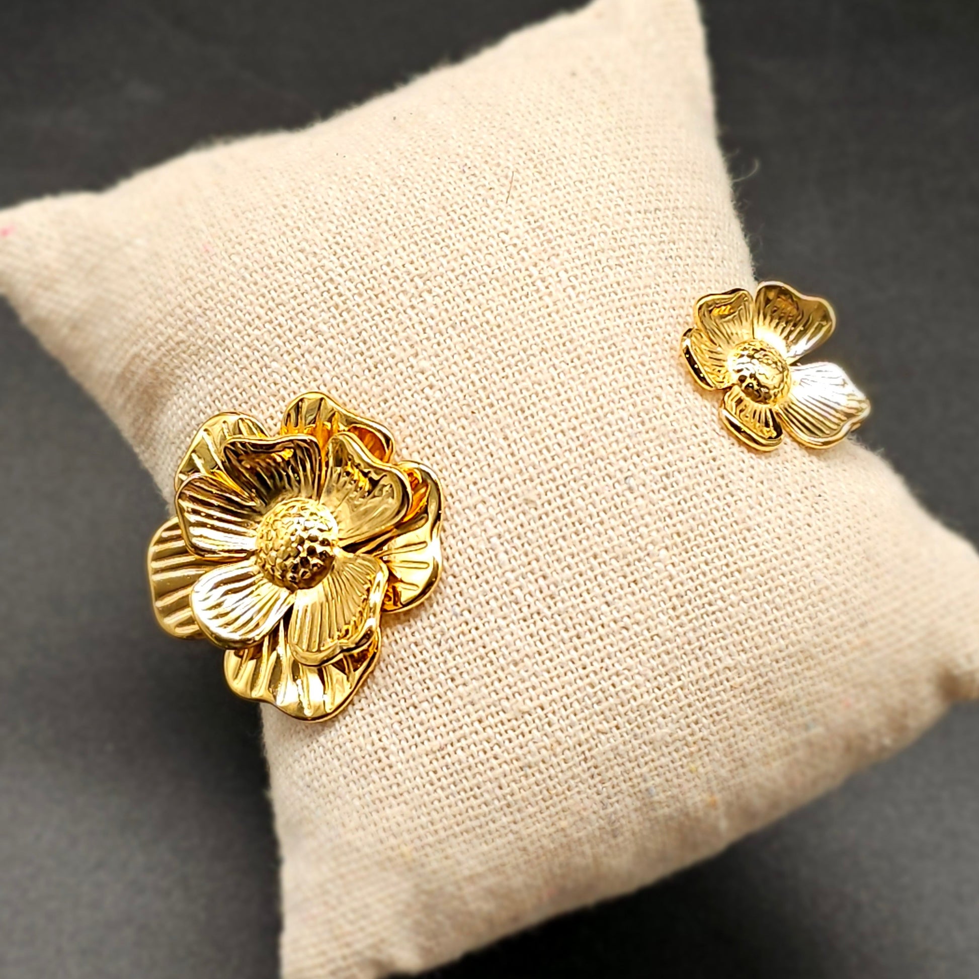 Bracelet jonc doré acier inoxydable – anneaux martelés & fleurs en relief