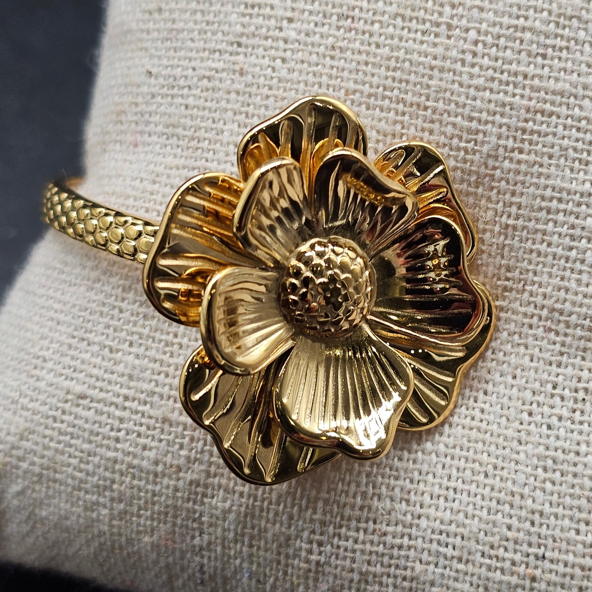 Ce bracelet jonc ouvert en acier inoxydable doré séduit par son anneau large à l’aspect martelé et ses ornements floraux en relief, qui donnent à l’ensemble un style à la fois original et raffiné.