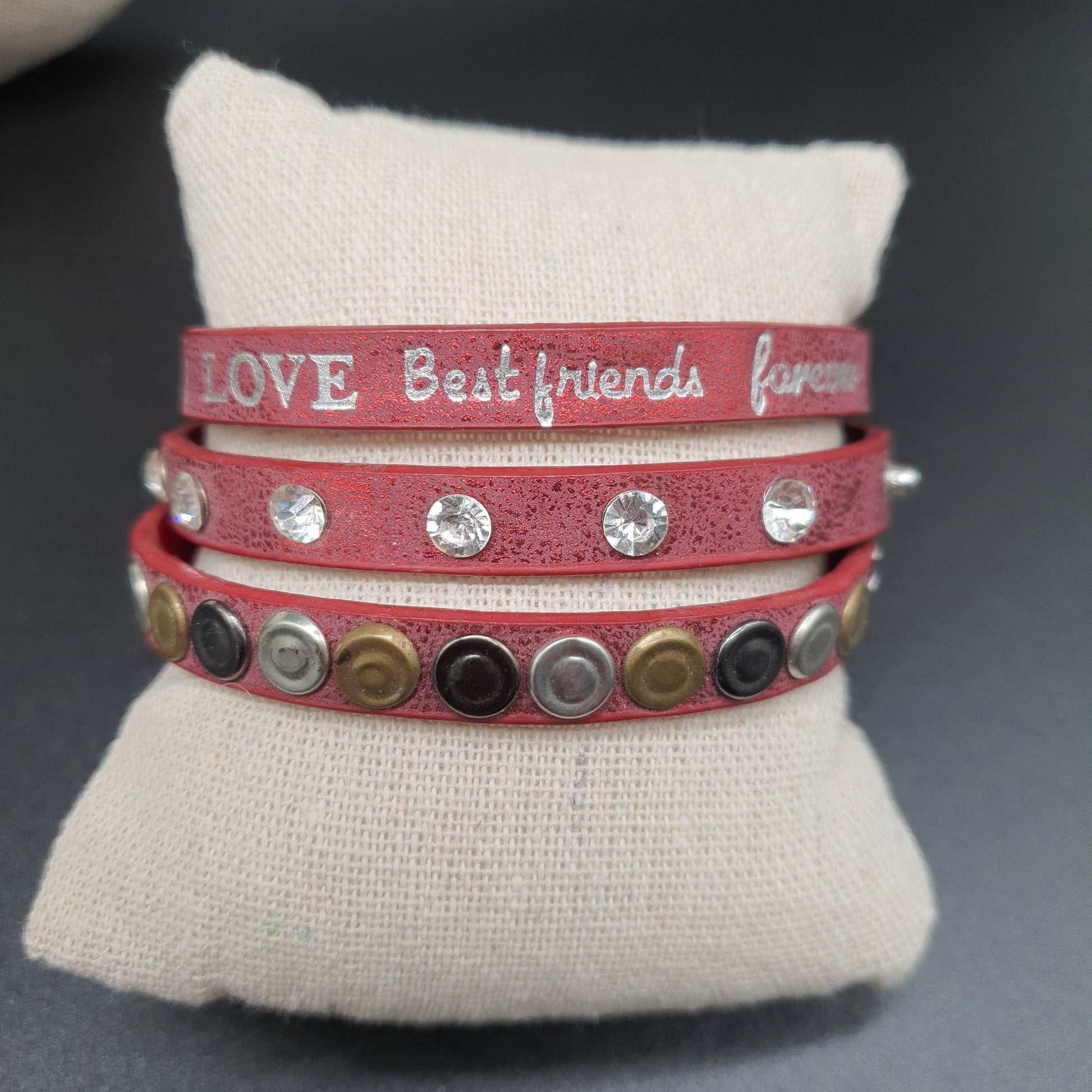 Laissez parler votre style avec ce bracelet multi-tours en simili cuir rouge, orné de pièces métal ciselé et d’une jolie inscription “Love” ❤️.
