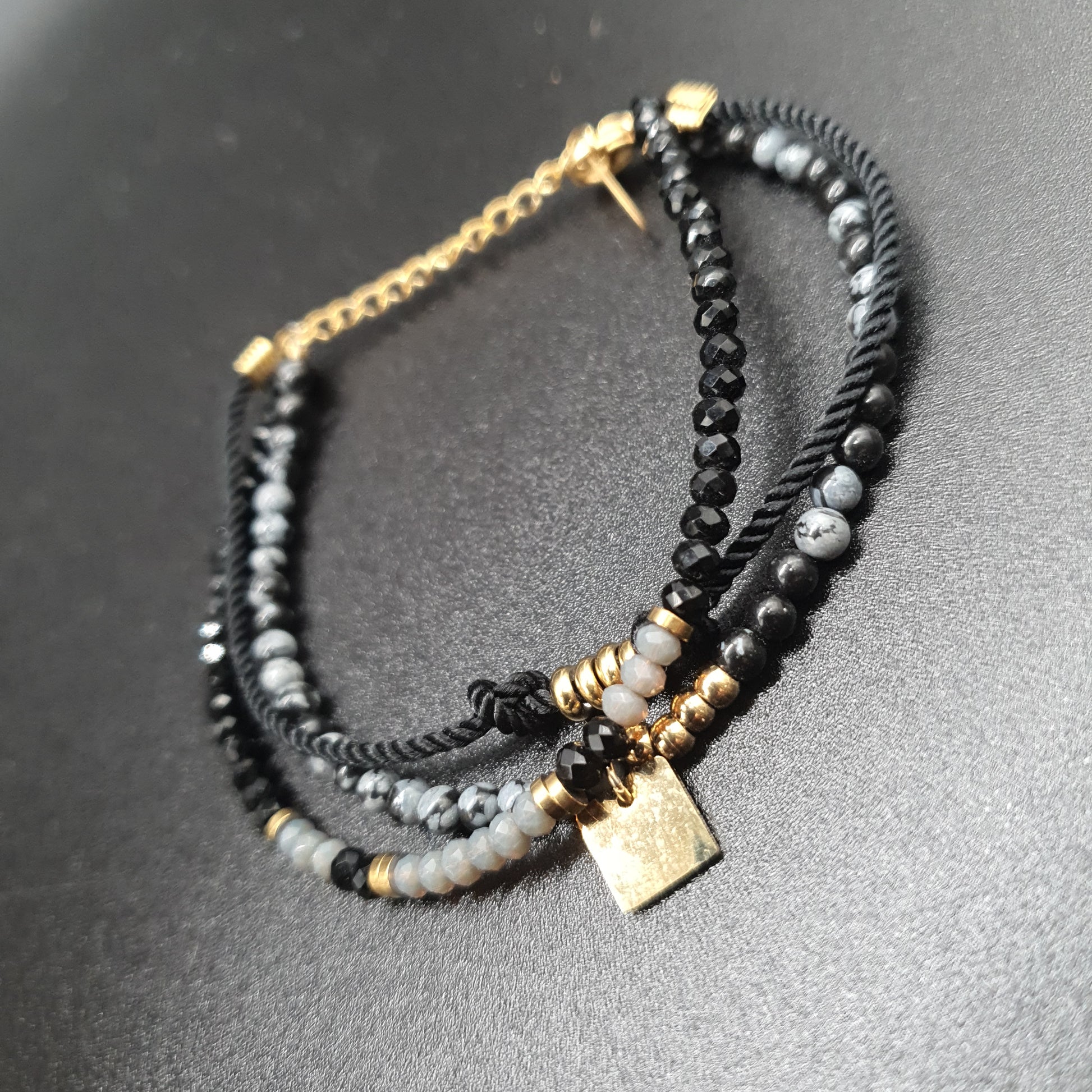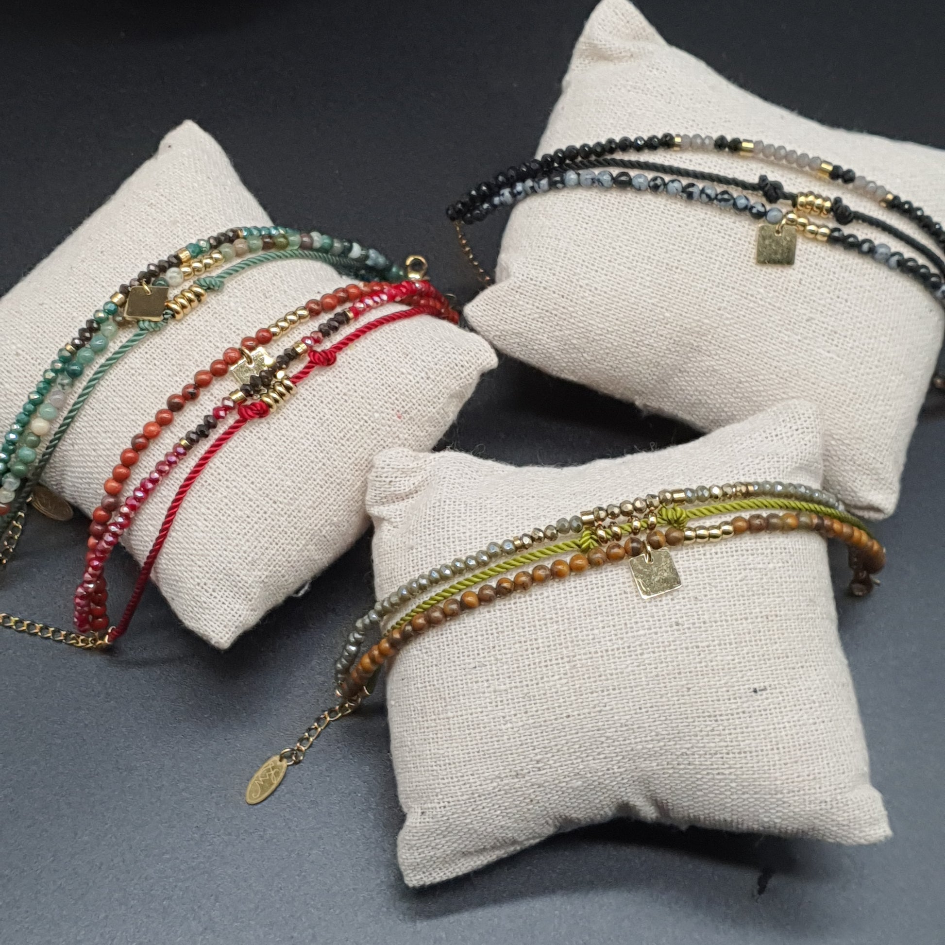 Ce bracelet triple rang associe l’élégance de l’acier inoxydable doré à la douceur d’un cordon tressé et à l’éclat des perles d’eau douce facettées. Un design harmonieux qui mêle brillance et naturel, idéal pour illuminer vos tenues en toute saison.