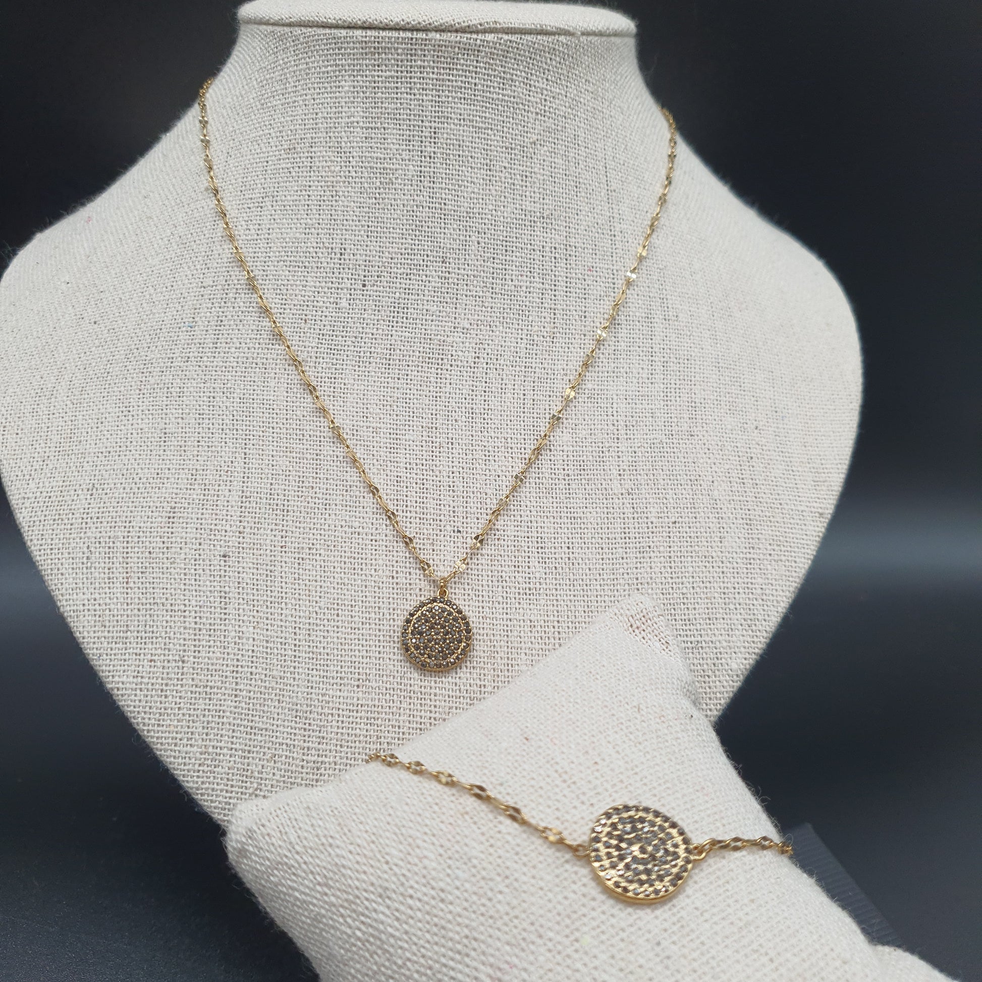 Parure collier et bracelet en acier doré constitué d'une fine chaîne en maille fantaisie torsadée, agrémenté d'un pendentif en métal doré surmonté de strass.