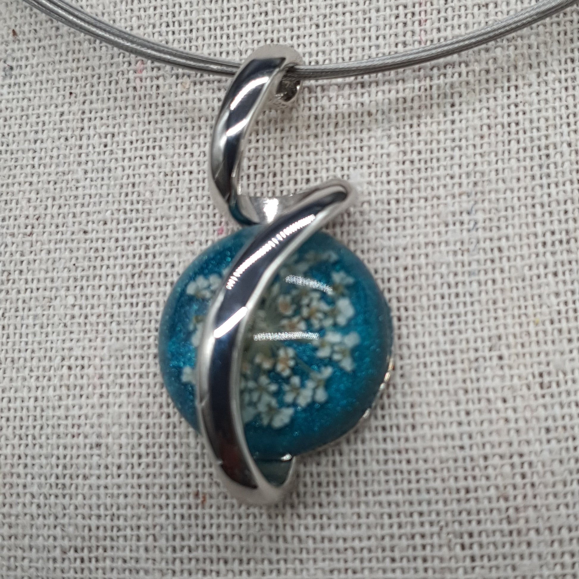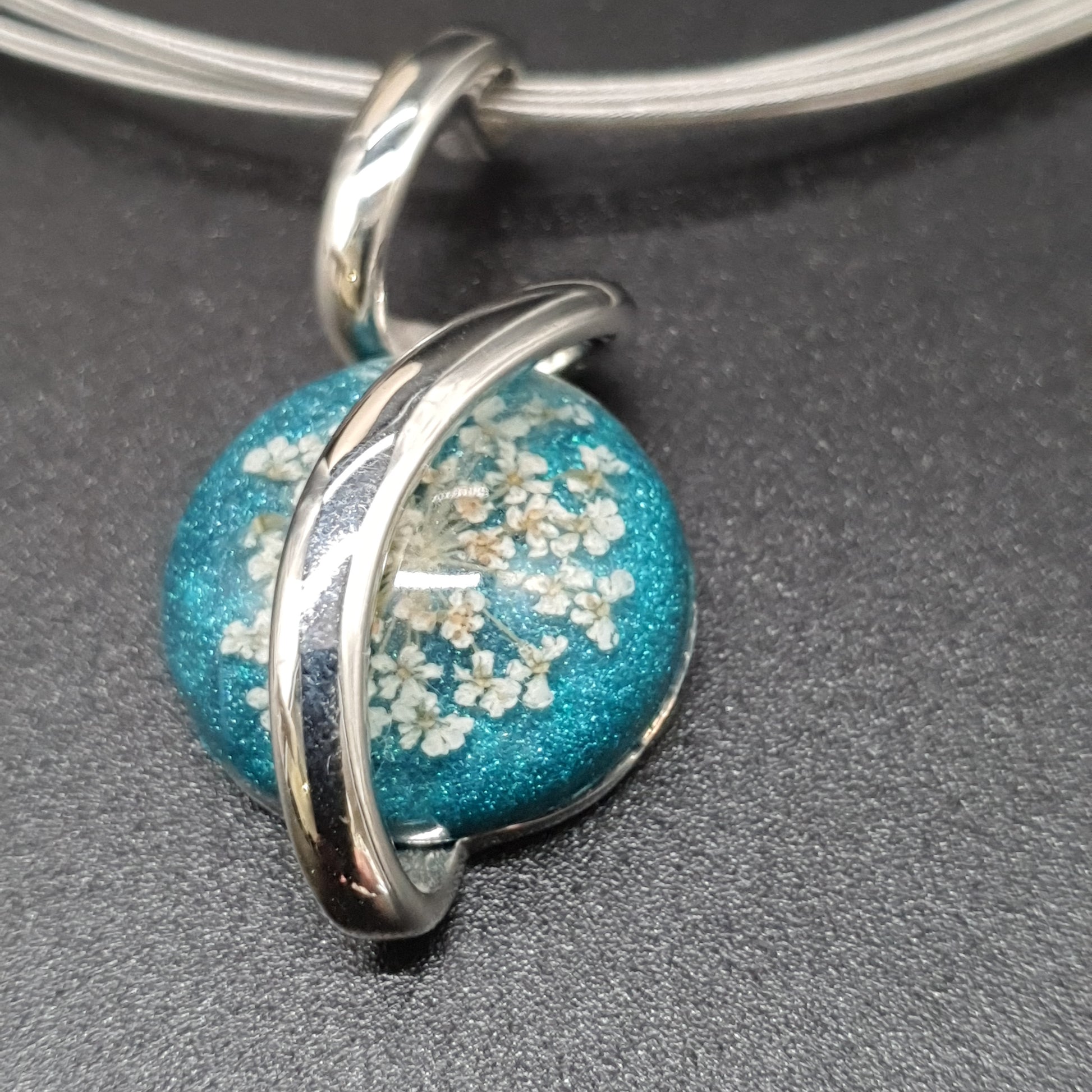 Collier câble multi-fils et pendentif rond résine – fleurs naturelles séchées