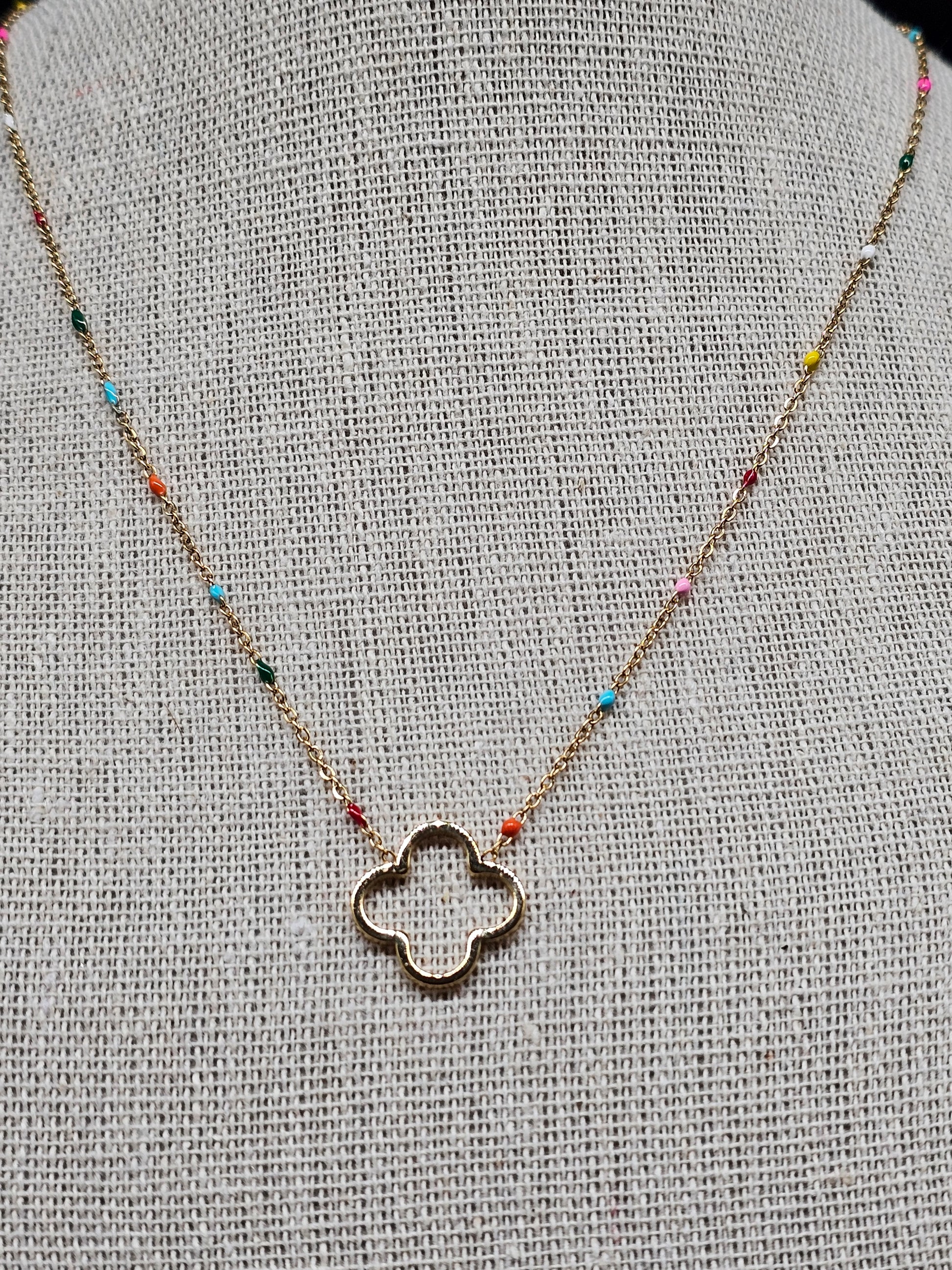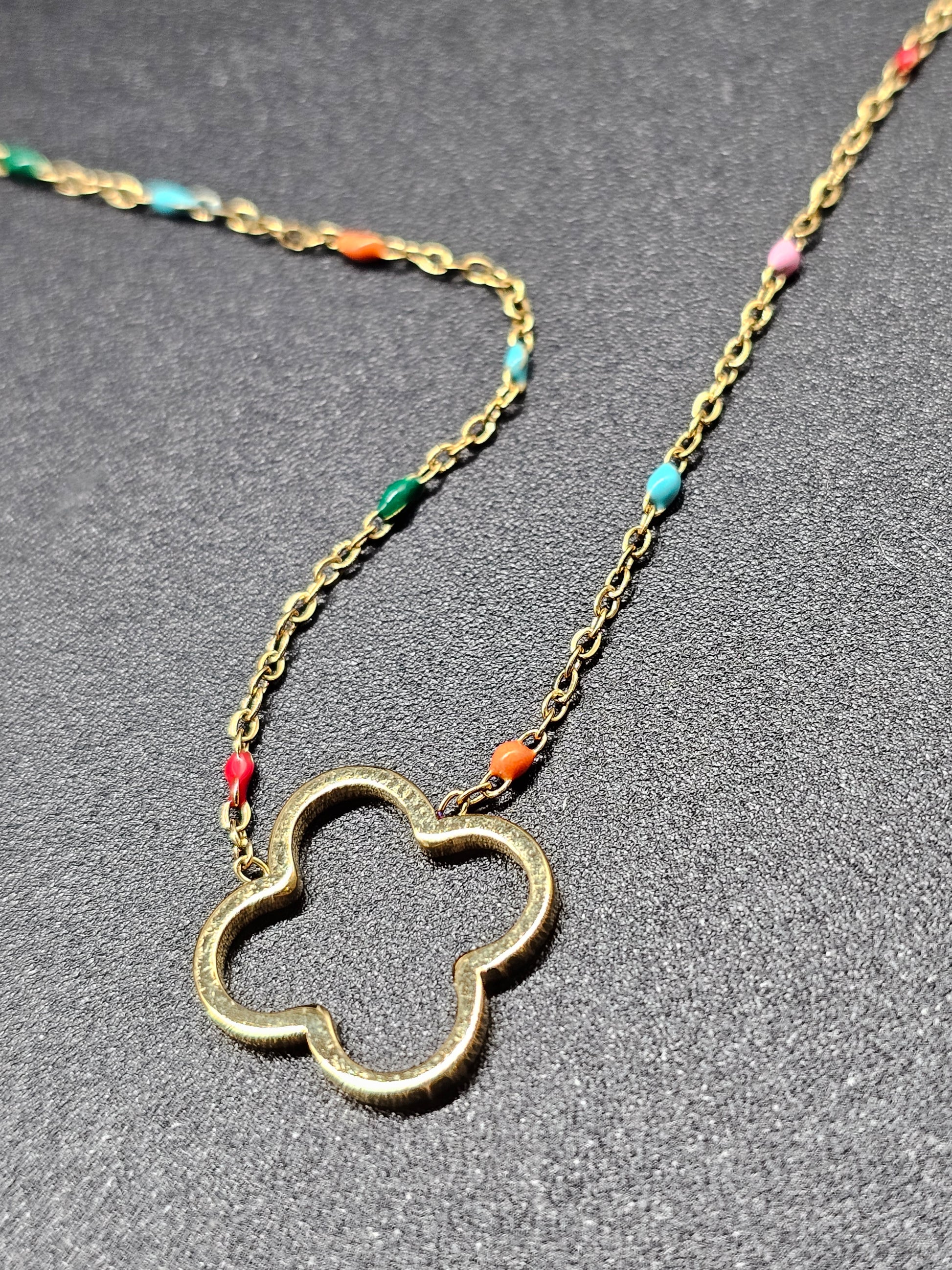 Collier doré en acier – maille forçat fine et trefle éclats pierre reconstituée