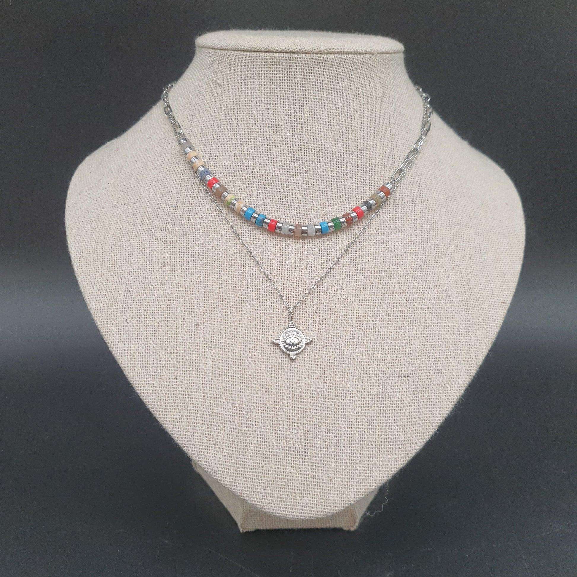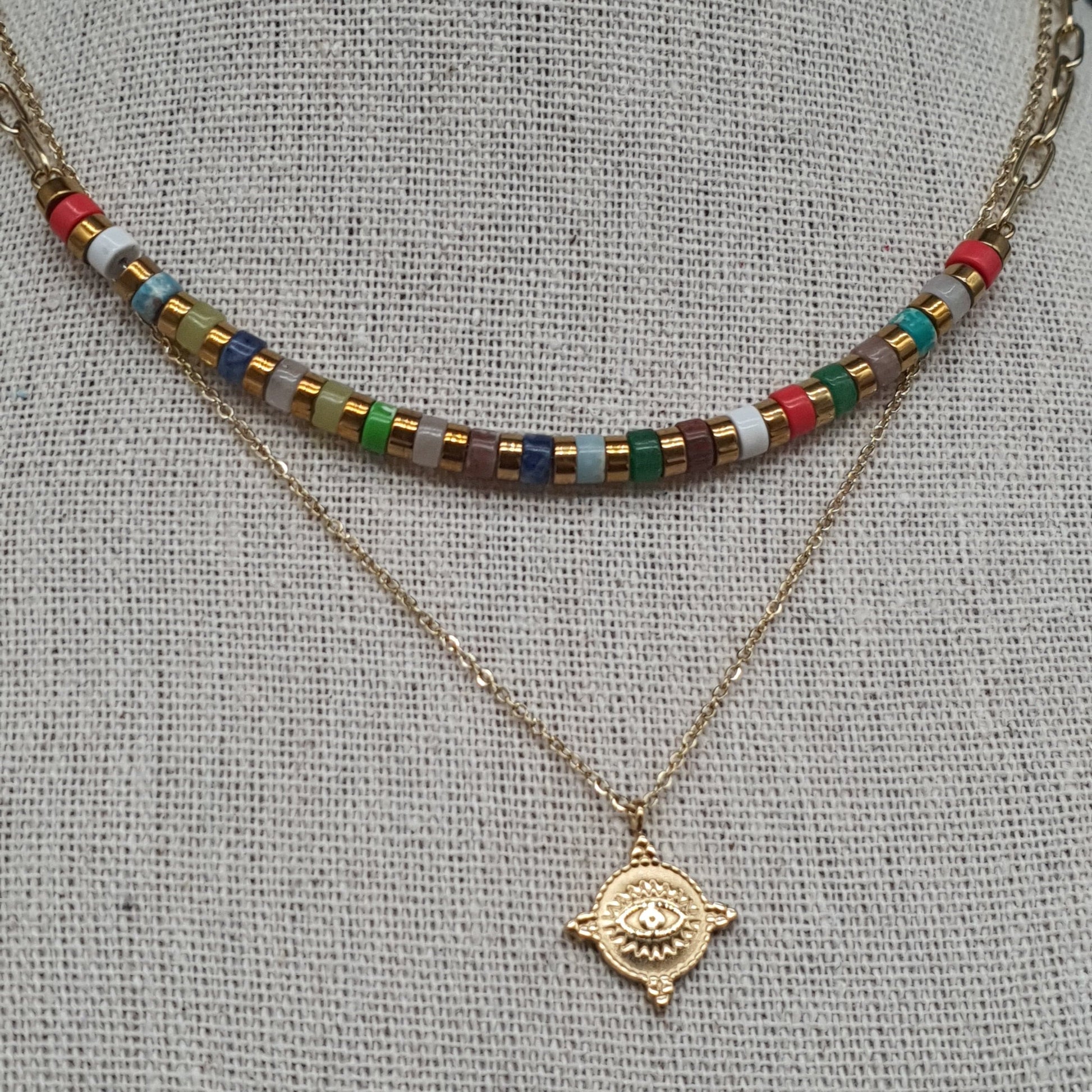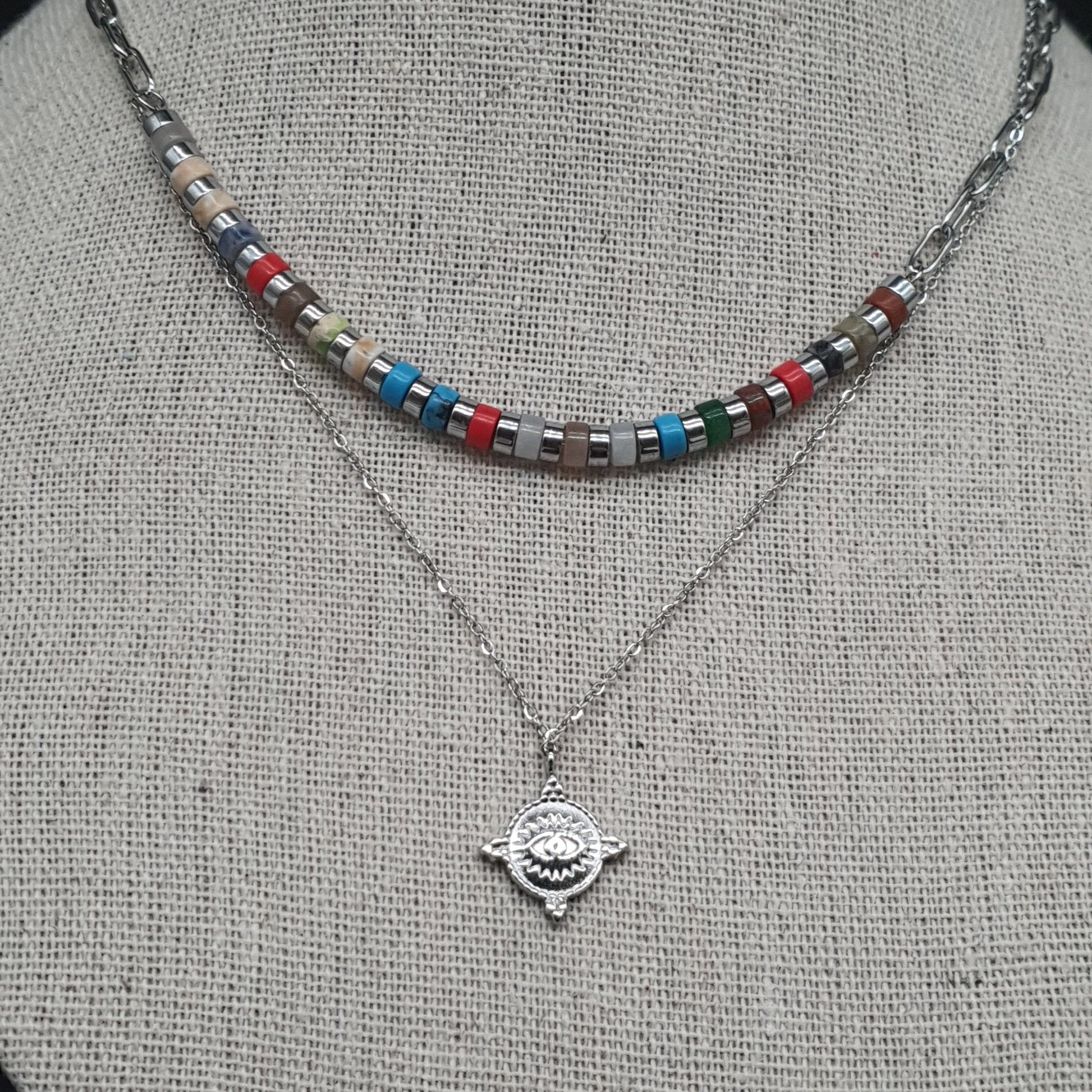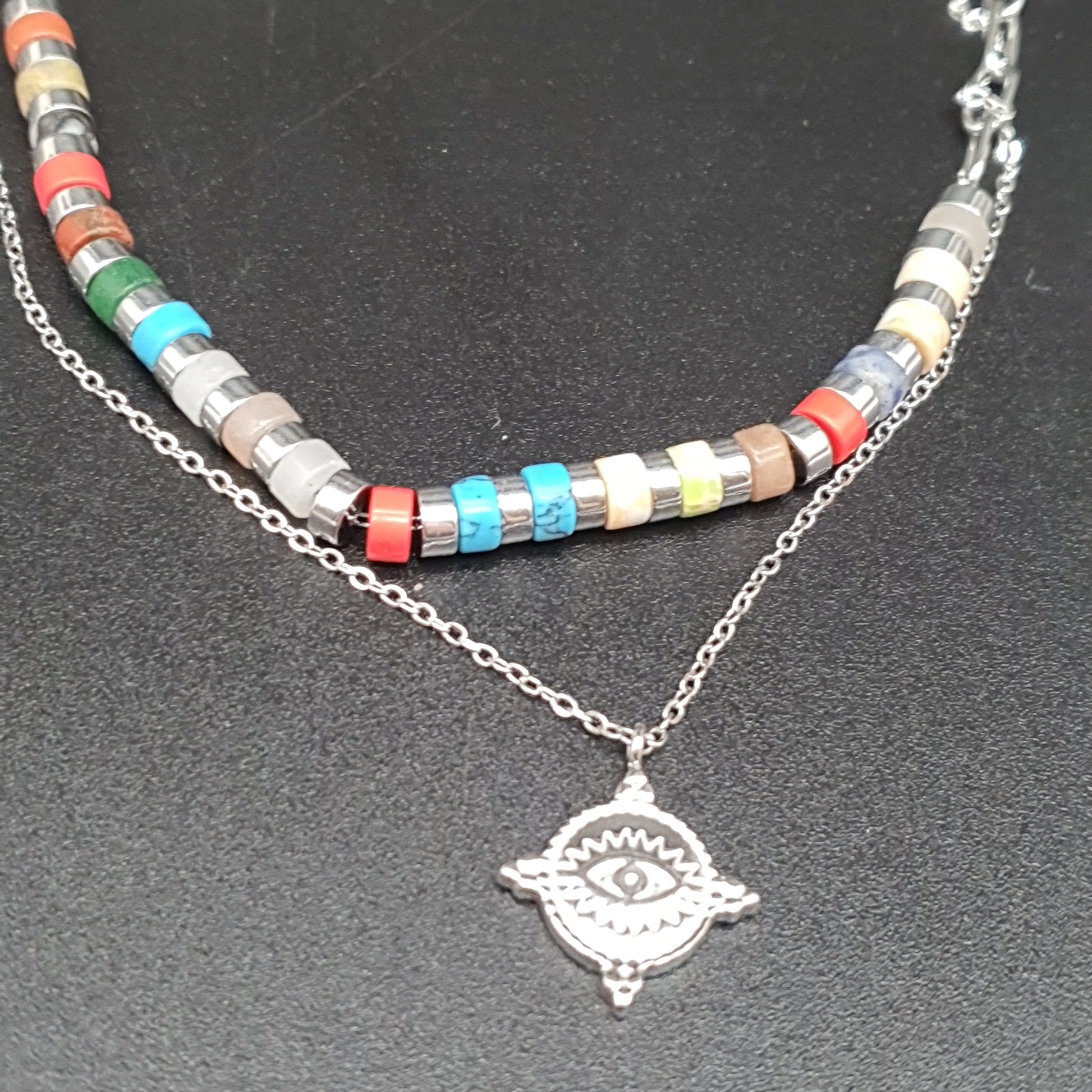 Collier double chaîne perlée acier inoxydable doré ou argenté avec médaillon fin œil mystique