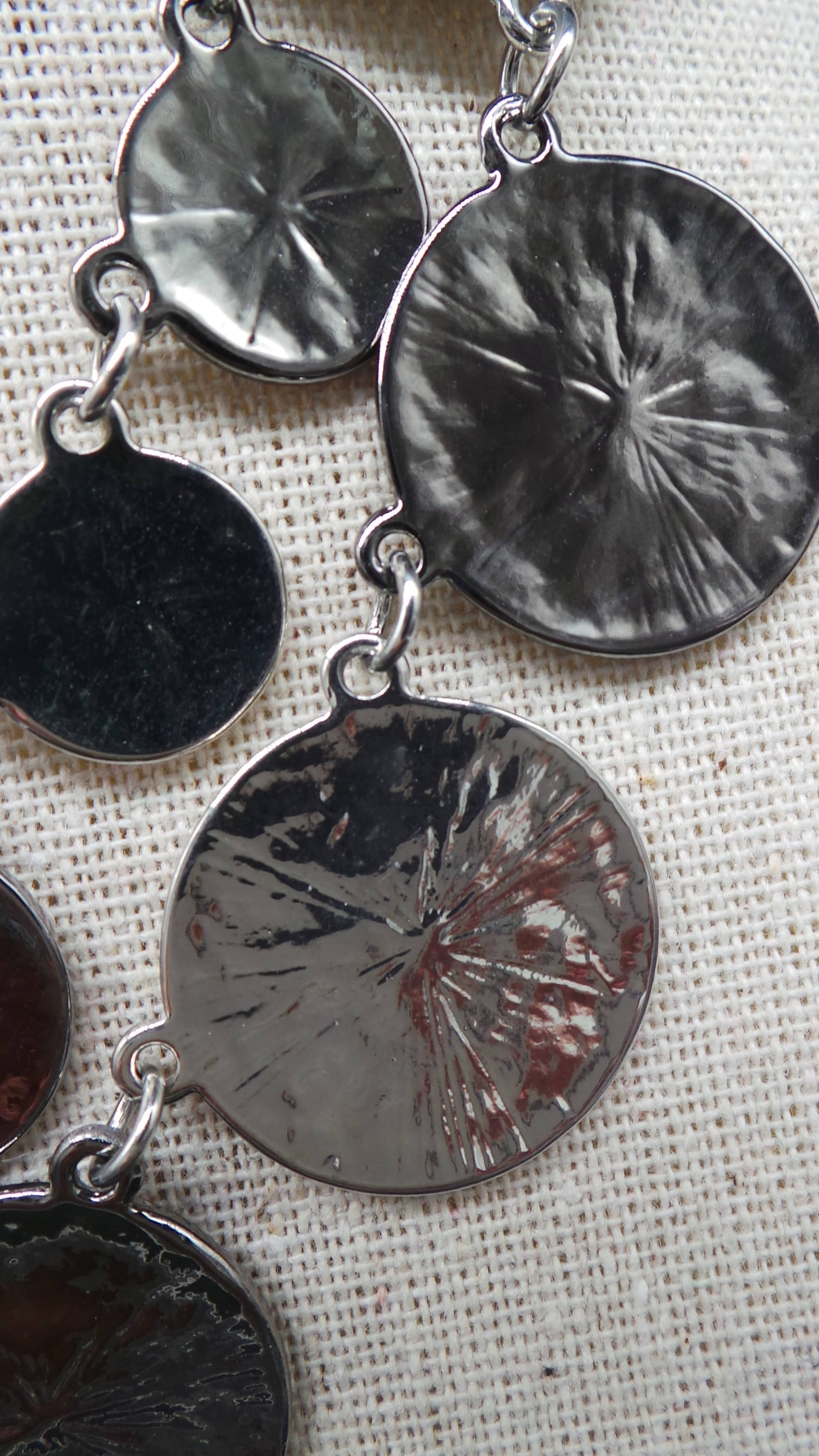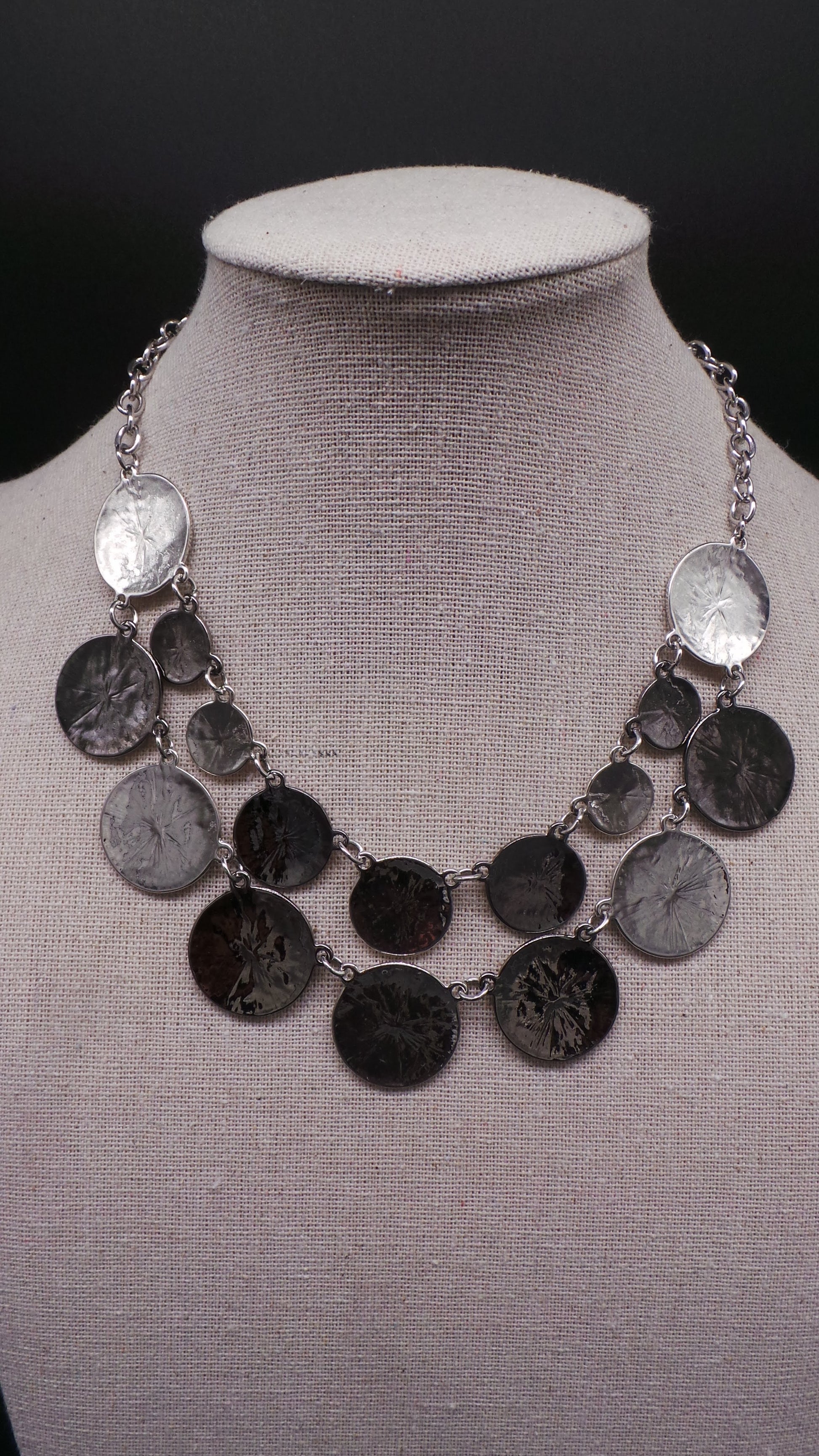 ✨ Collier double rang en acier, monté sur une chaîne maille forçat, orné de pièces rondes martelées en métal argenté.
