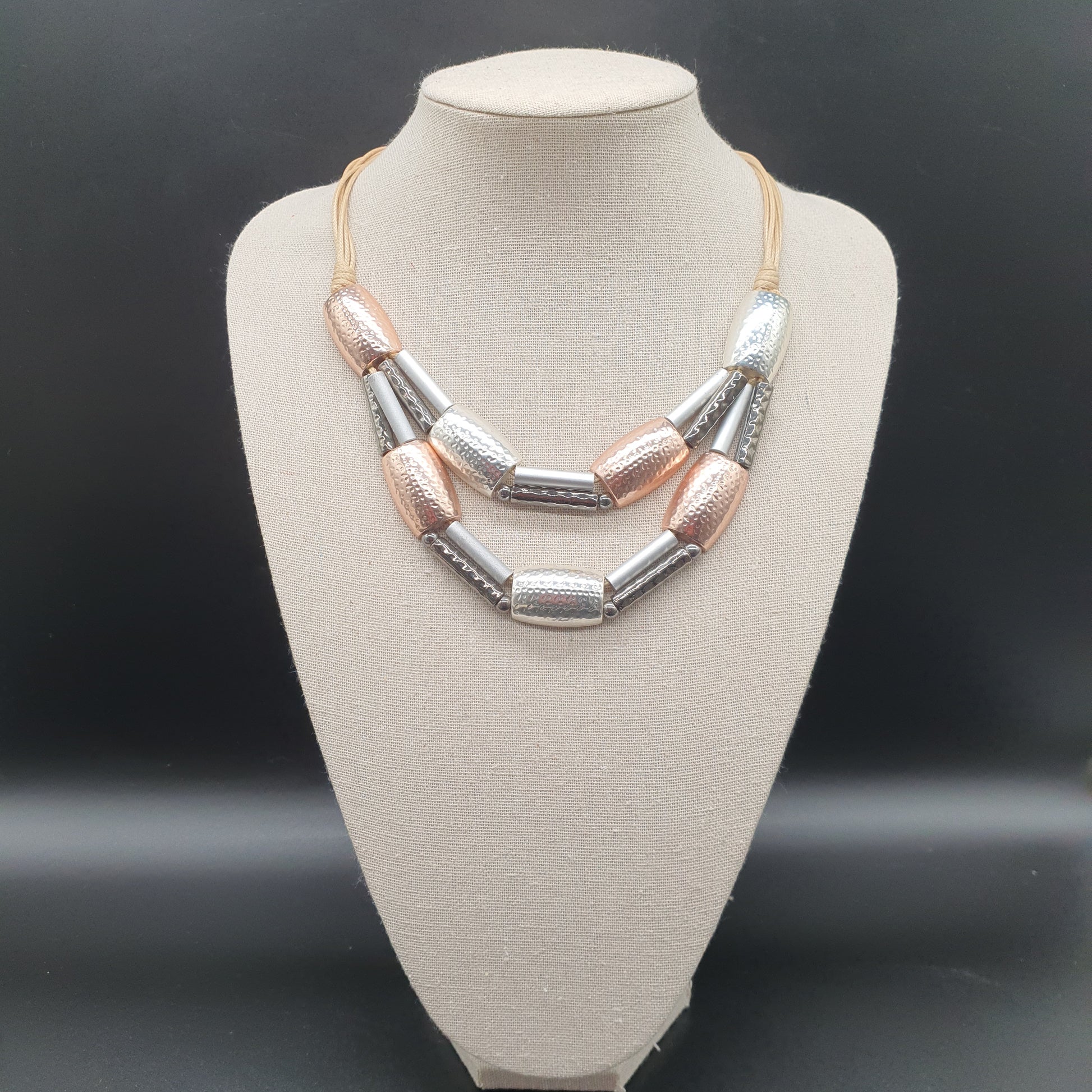 ✨ Collier double rang composé de multi-cordons en coton ciré agrémentés de pièces en forme de demi-tubes en métal martelé doré et argenté, pour un style affirmé et chic.