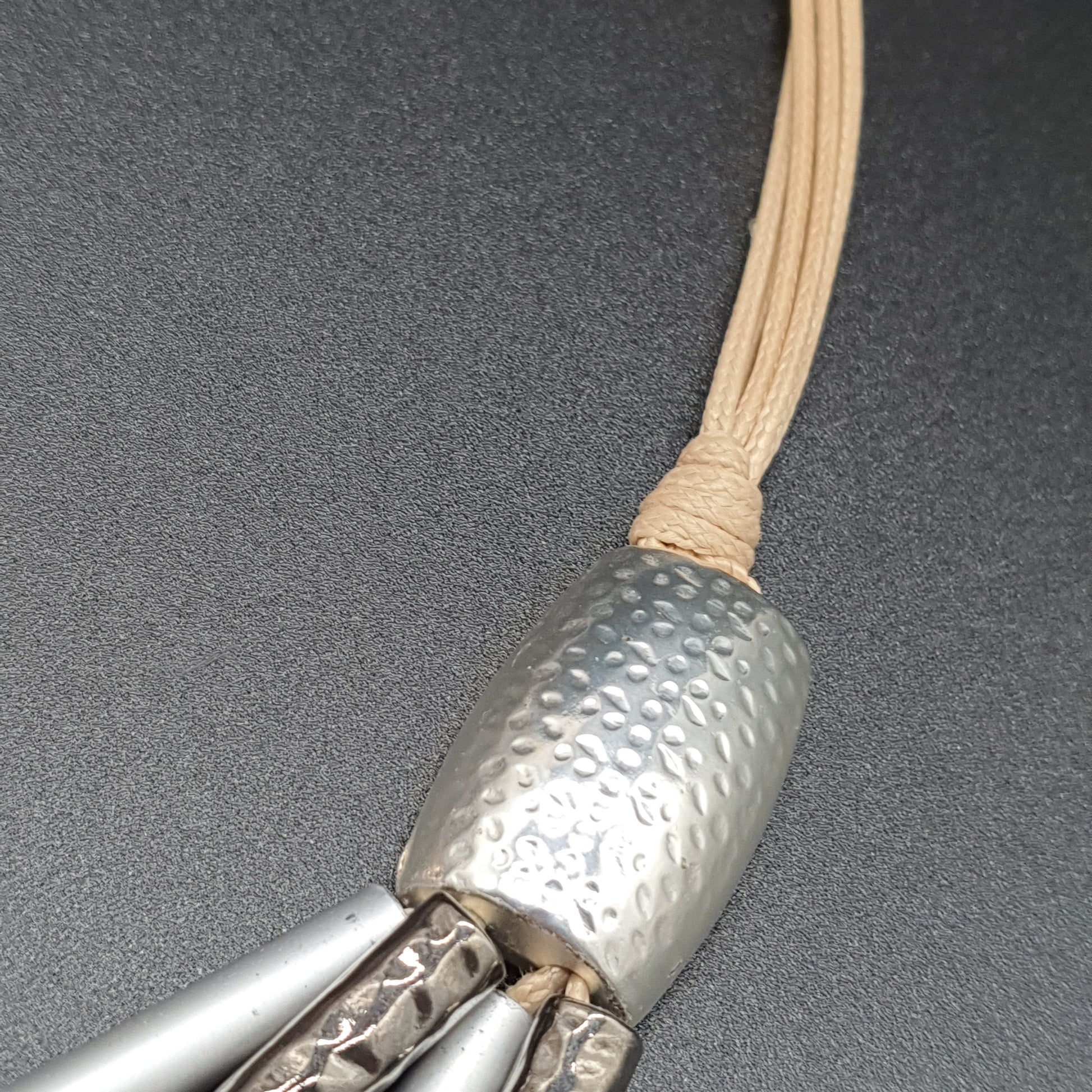 Collier double rang multi-cordons coton ciré & demi-tubes métal martelé doré et argenté