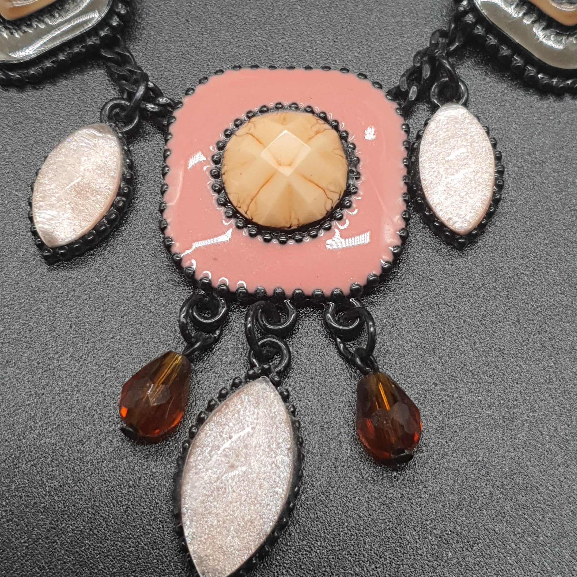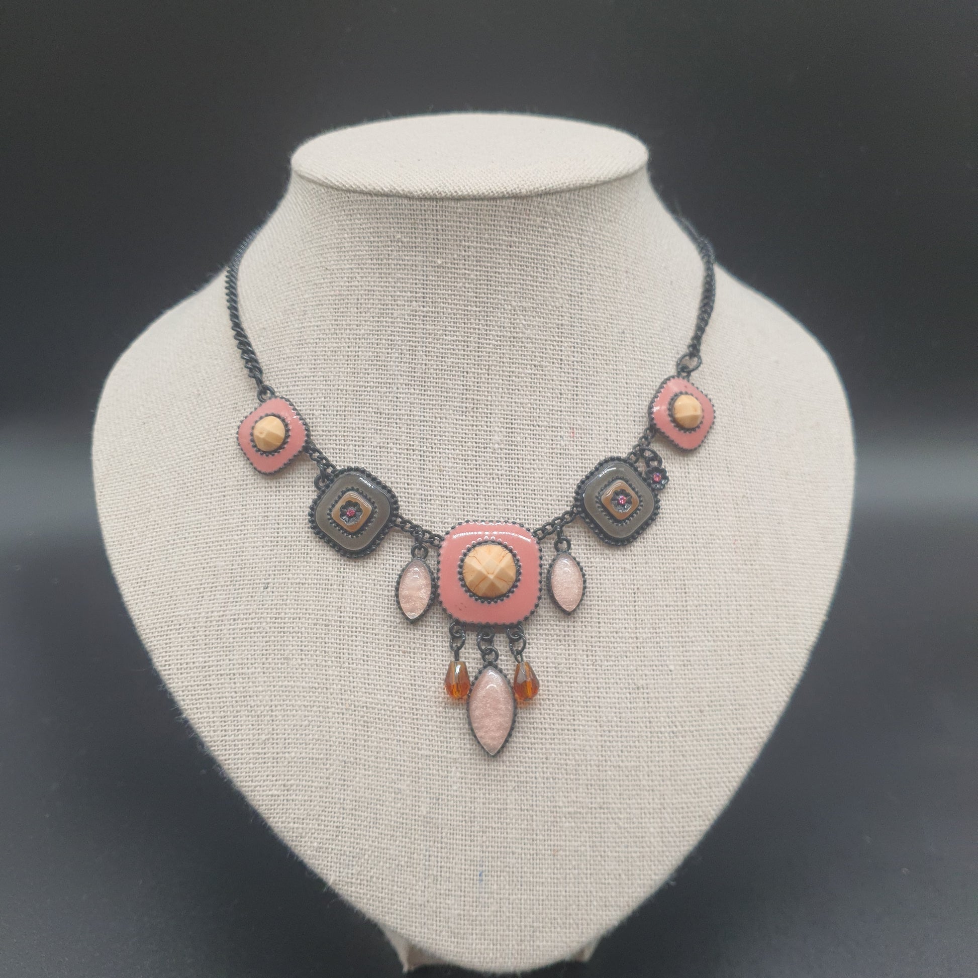 💠 Orné de pièces géométriques en métal noir et cuivre émaillé, ce bijou joue sur les contrastes de matières et de formes.