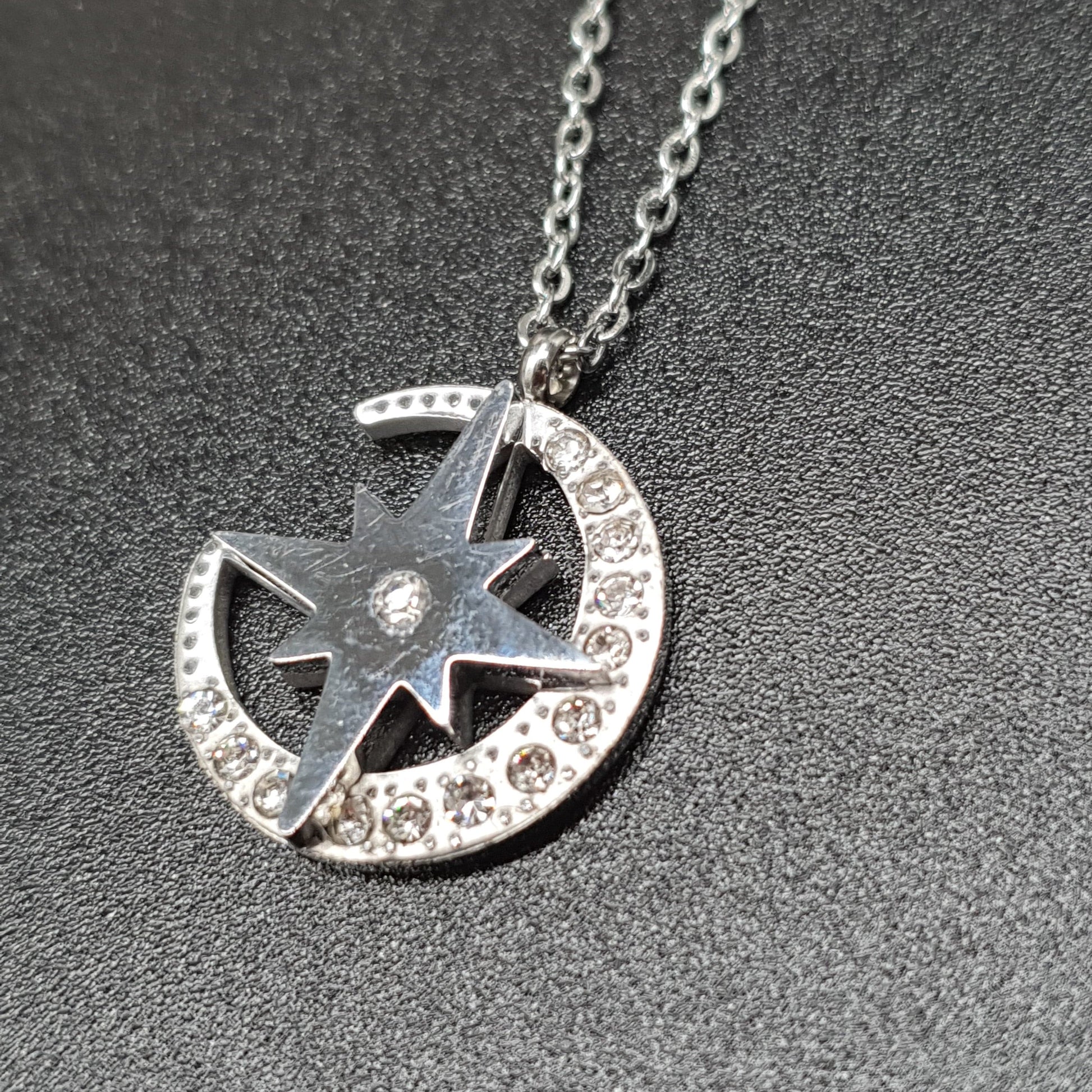 🌙 Son pendentif représente une lune incurvée, sublimée par une étoile polaire délicatement incrustée en son centre.