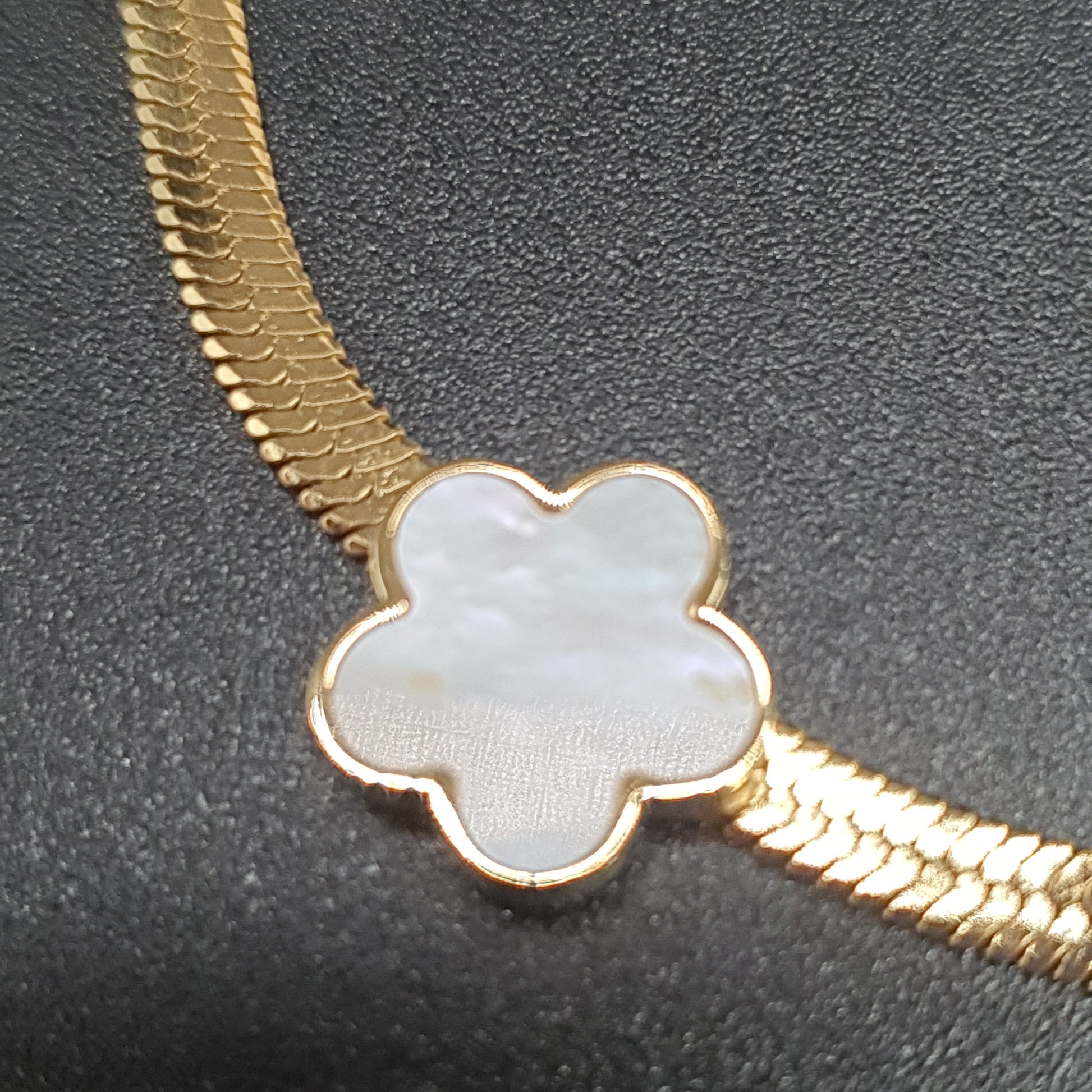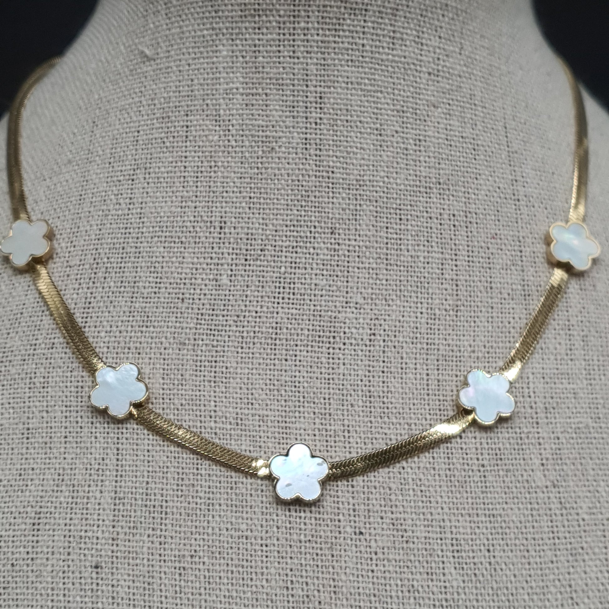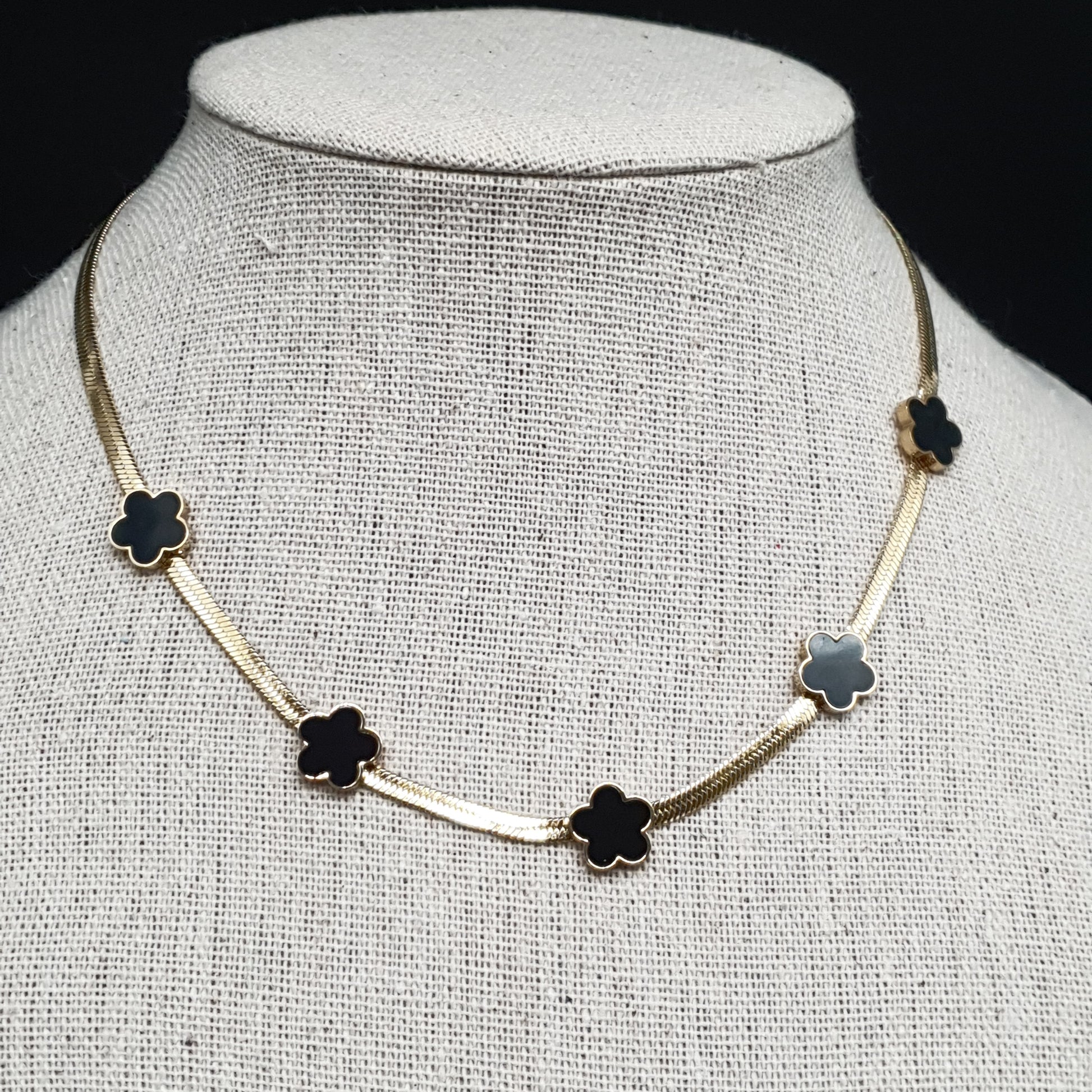 Collier acier inoxydable doré maille miroir fleurs dorées nacre ou noir