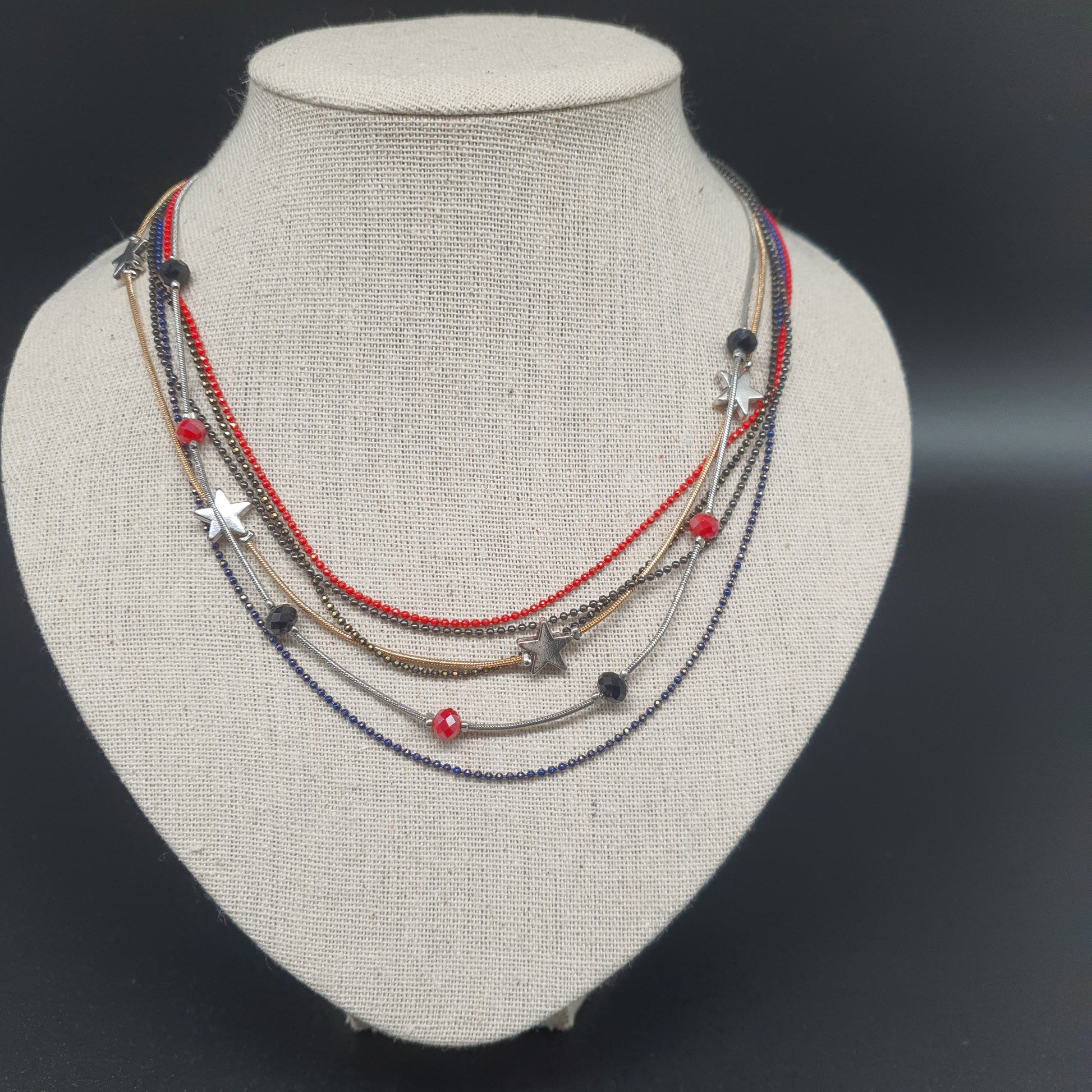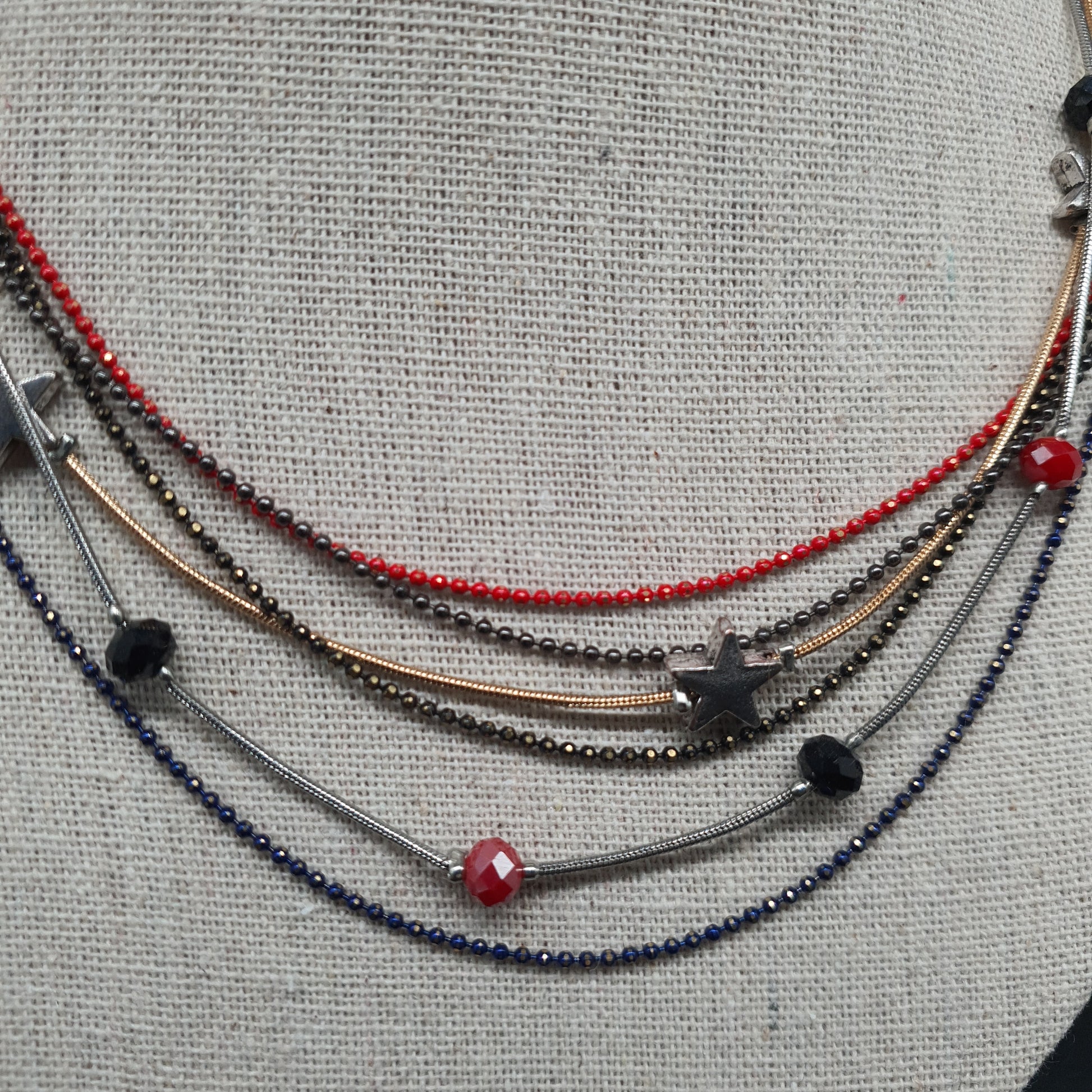Collier multi-rangs acier argenté étoile– Chaînettes fines & perles colorées