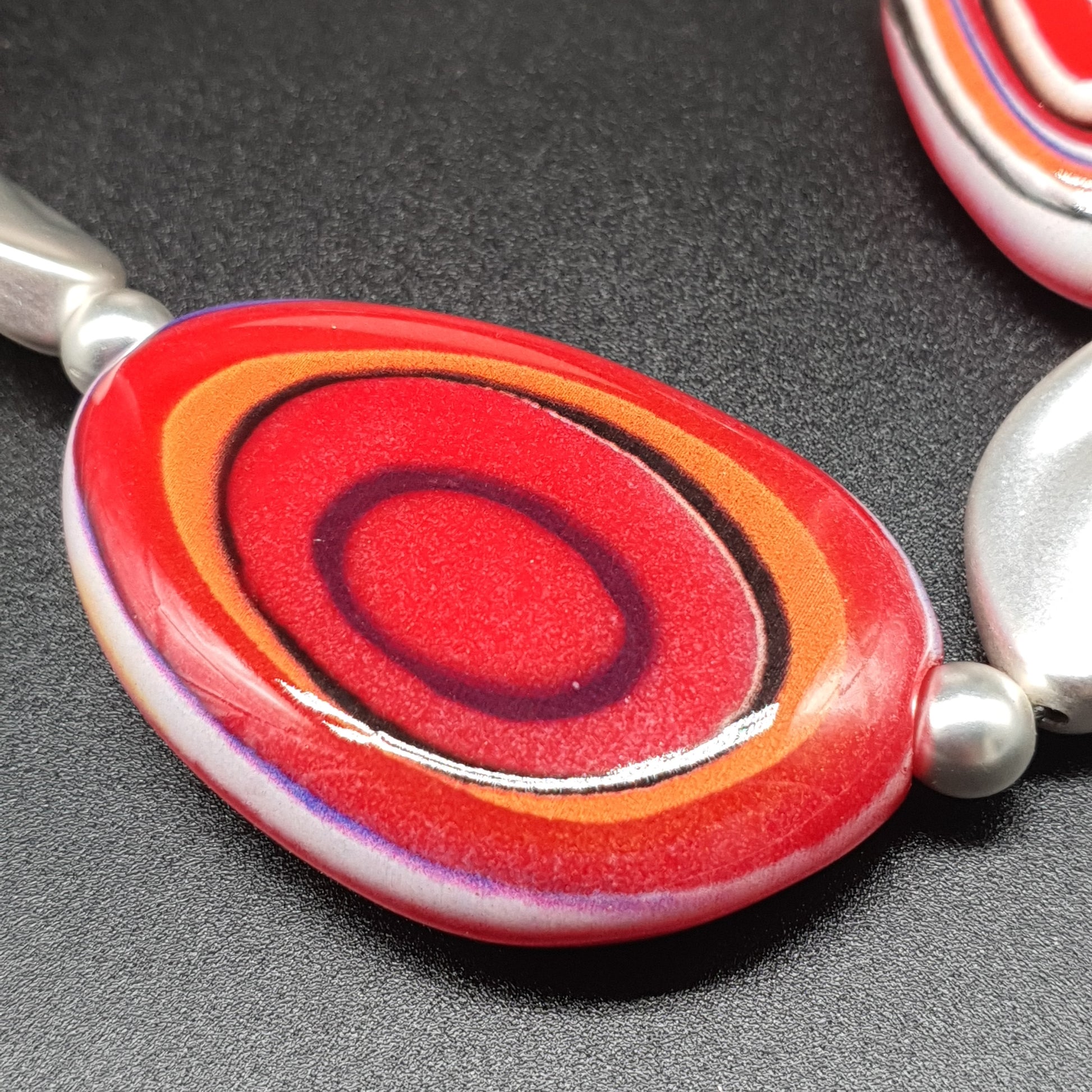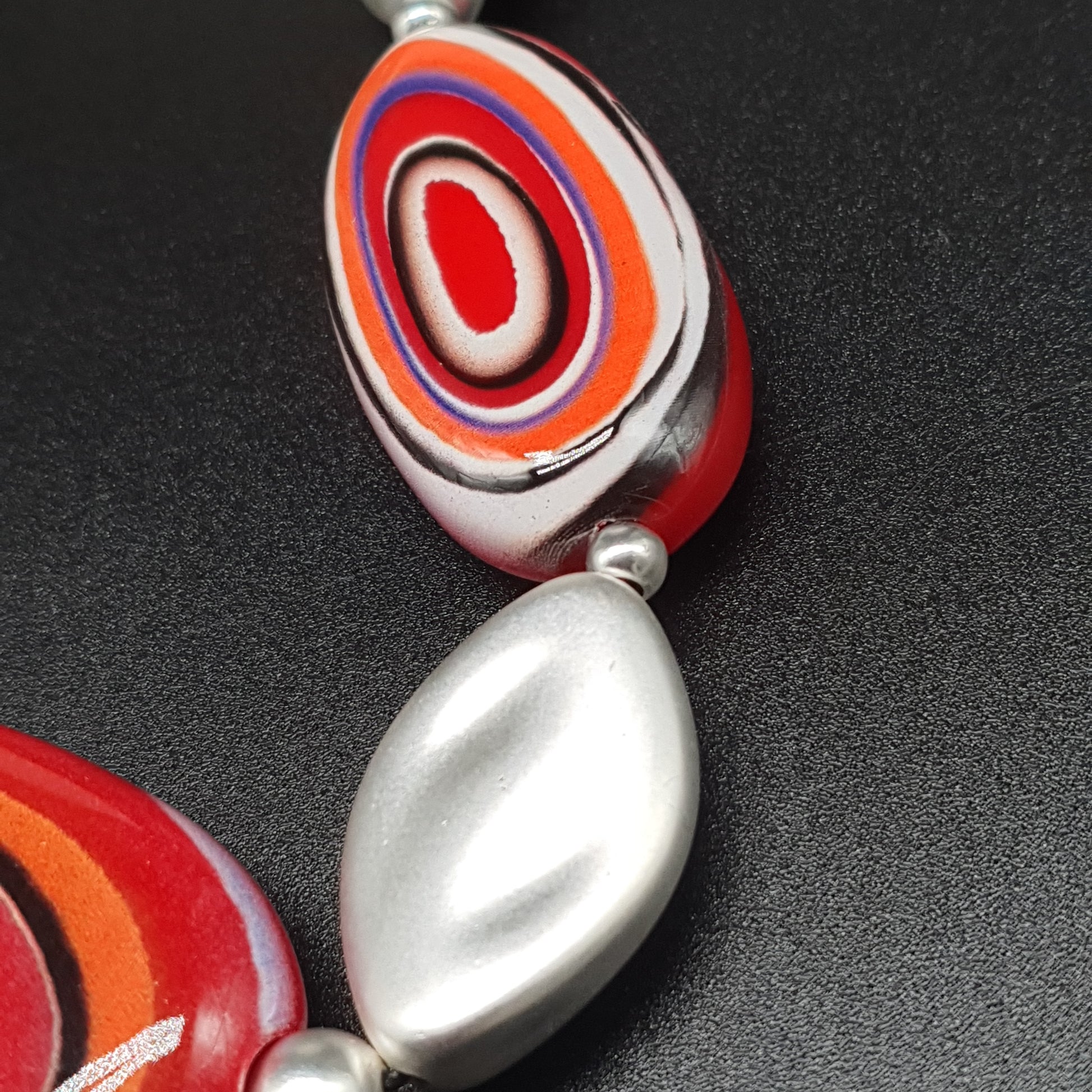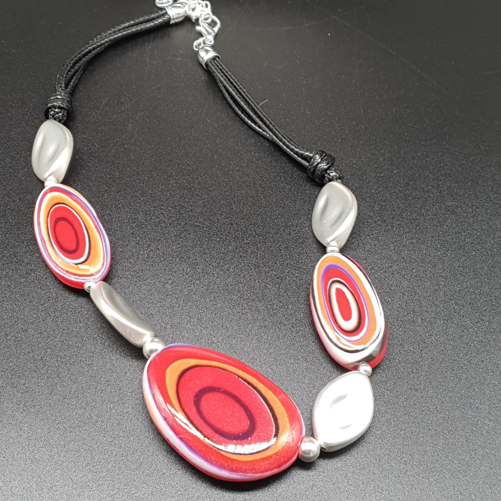 Collier plastron vintage rouge – Double cordon coton ocré et galets résine métallisée