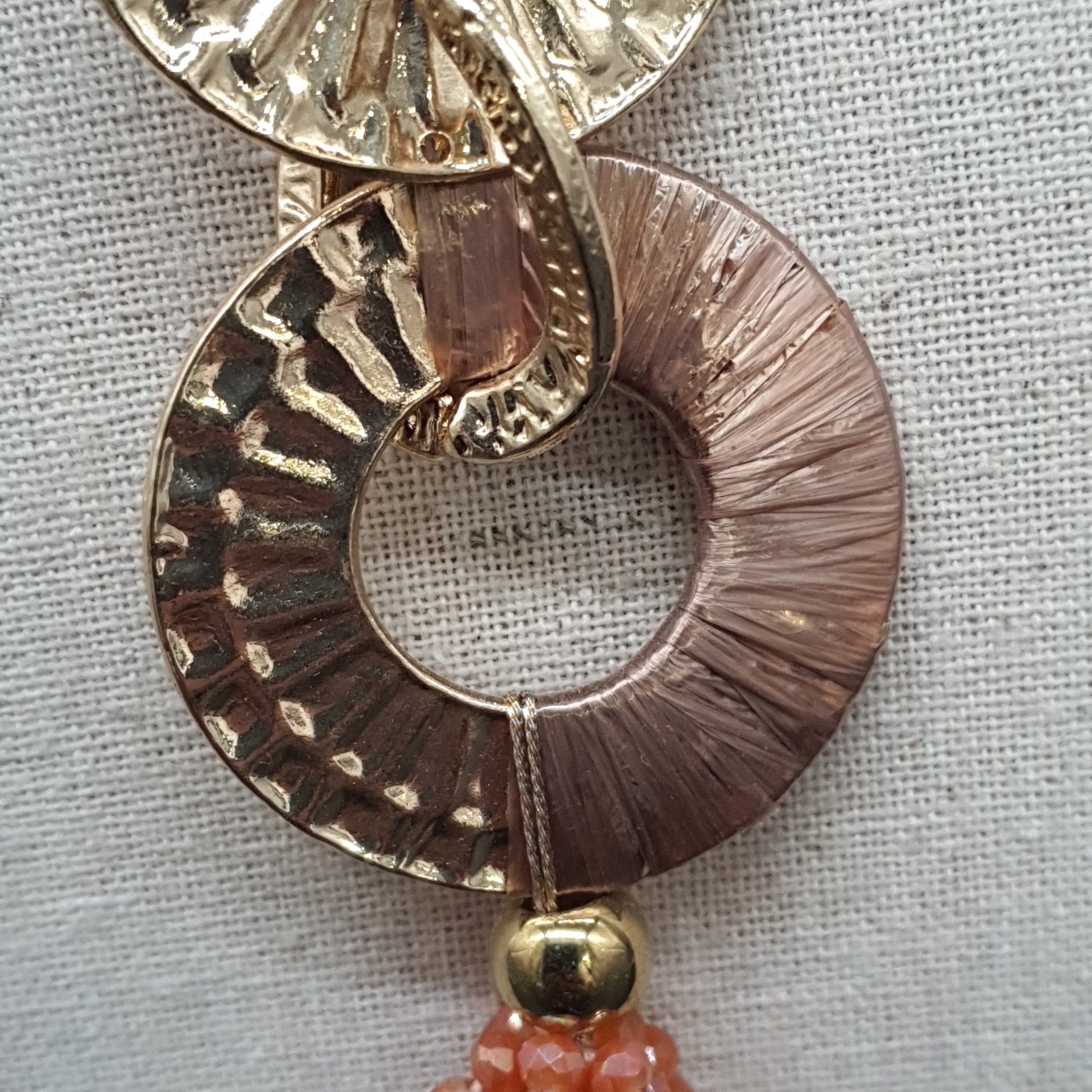 ✨ Collier sautoir multi-cordons au style bohème chic, orné d’un élégant anneau central martelé en métal doré vieilli, avec un pendentif travaillé et ajouré suspendu.
