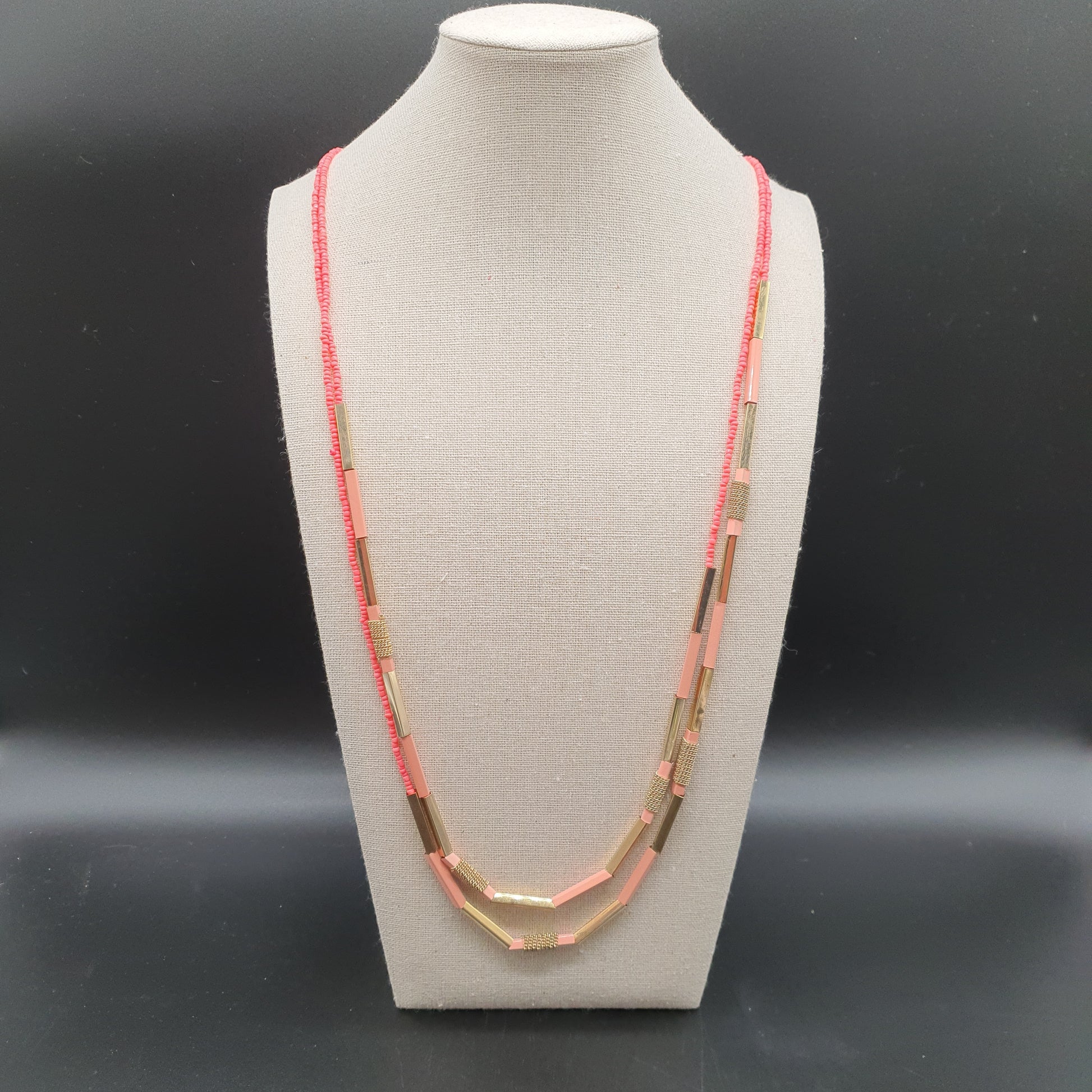 Collier sautoir double rang perles de rocaille roses tubes dorés fins allongés