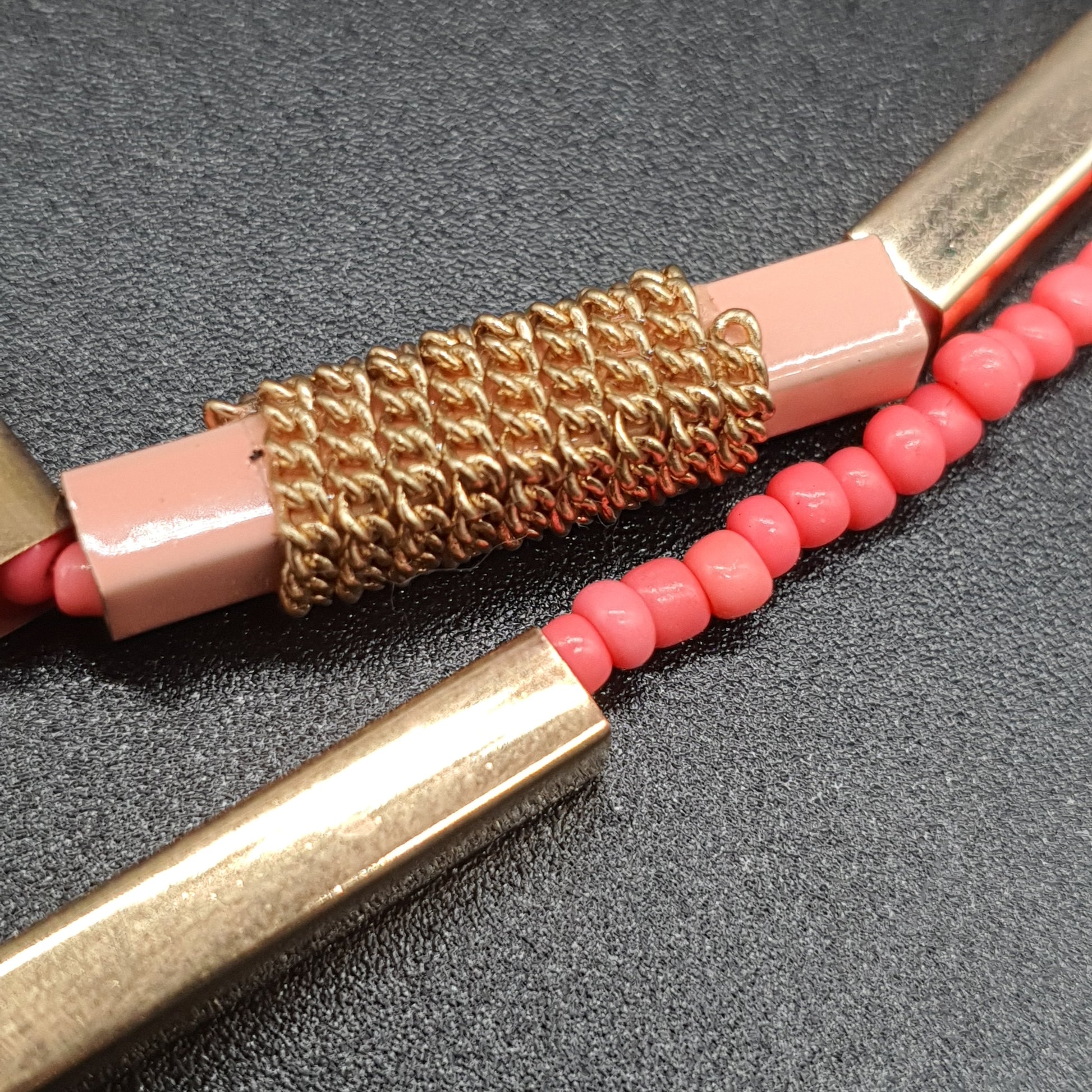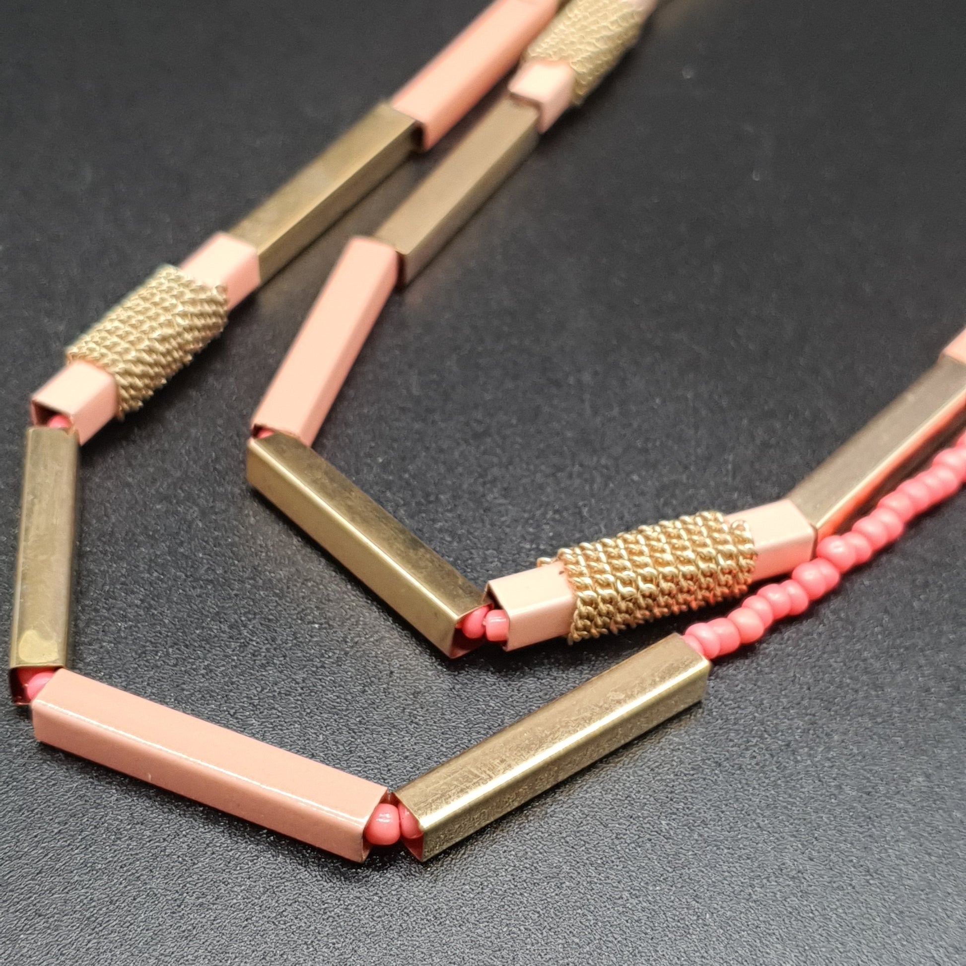 Ce bijou se compose de deux chaînes fines dorées, ornées de perles de rocaille roses et de tubes métalliques allongés dorés, apportant une touche graphique et raffinée.