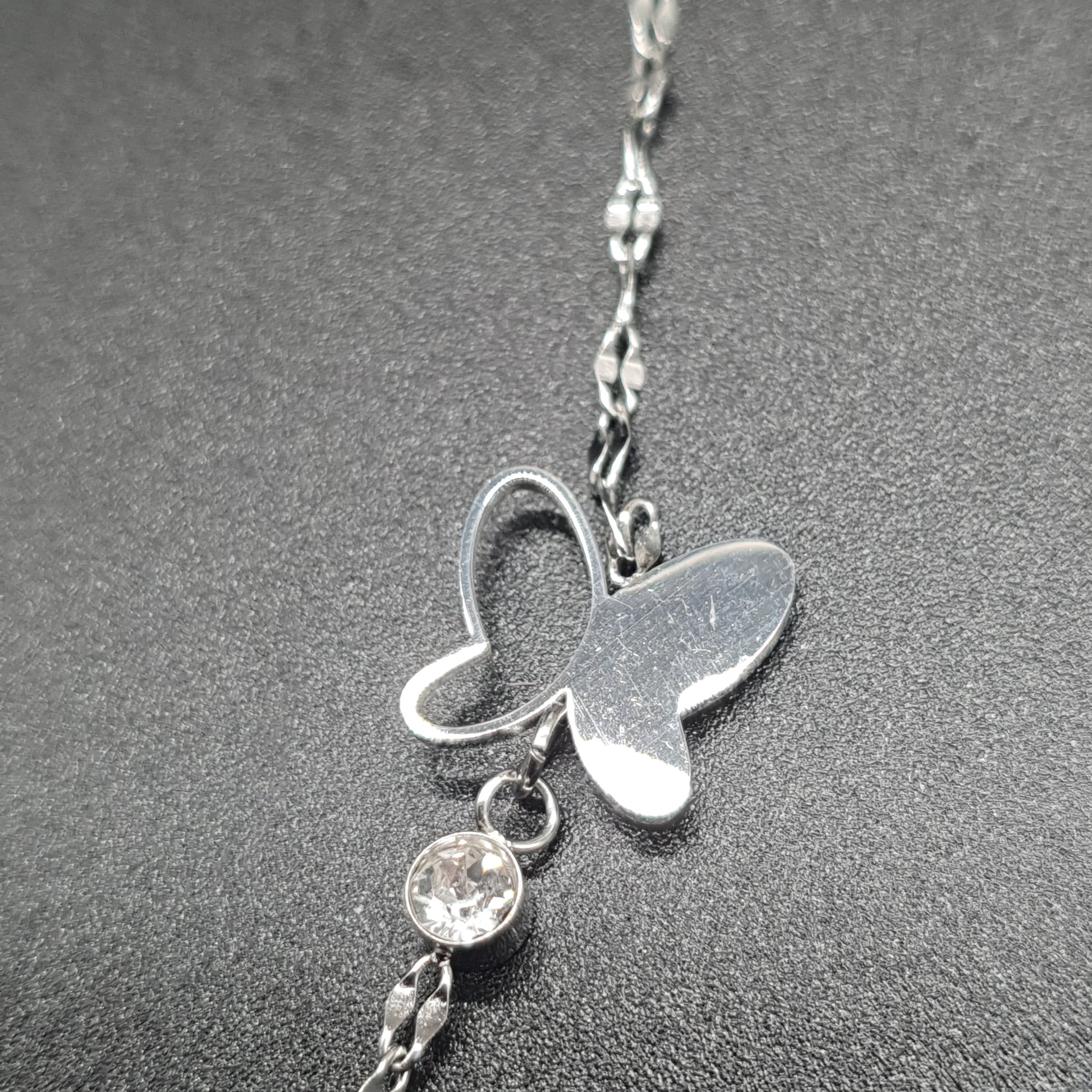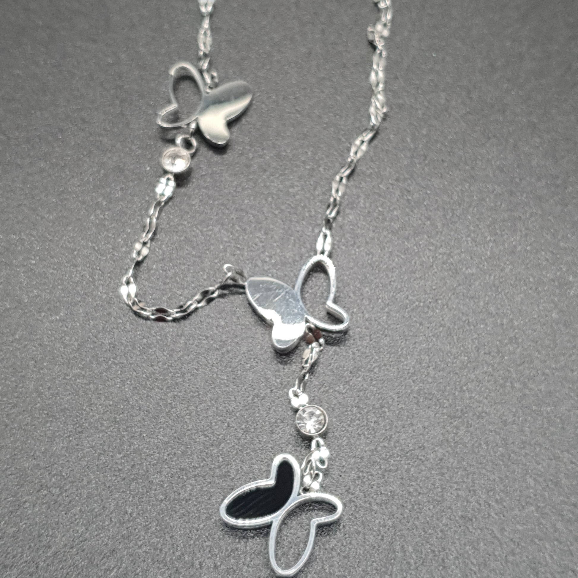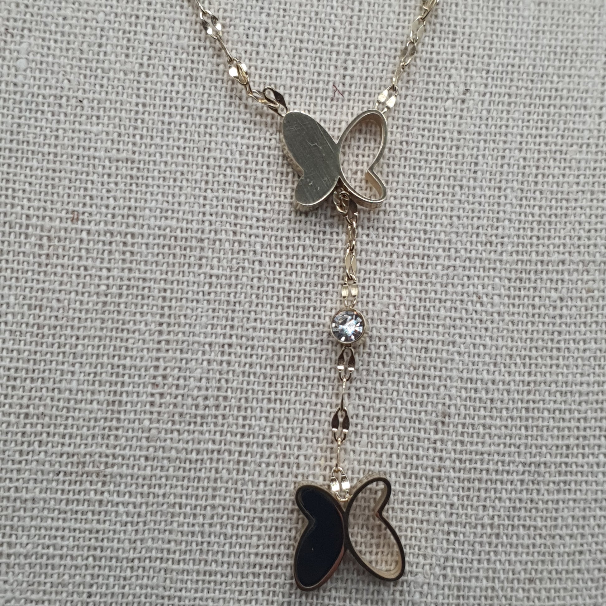 🌟 Le pendentif central se compose d'une forme torsadée élégante, ornée d’un délicat papillon en nacre, symbole de légèreté et de transformation.