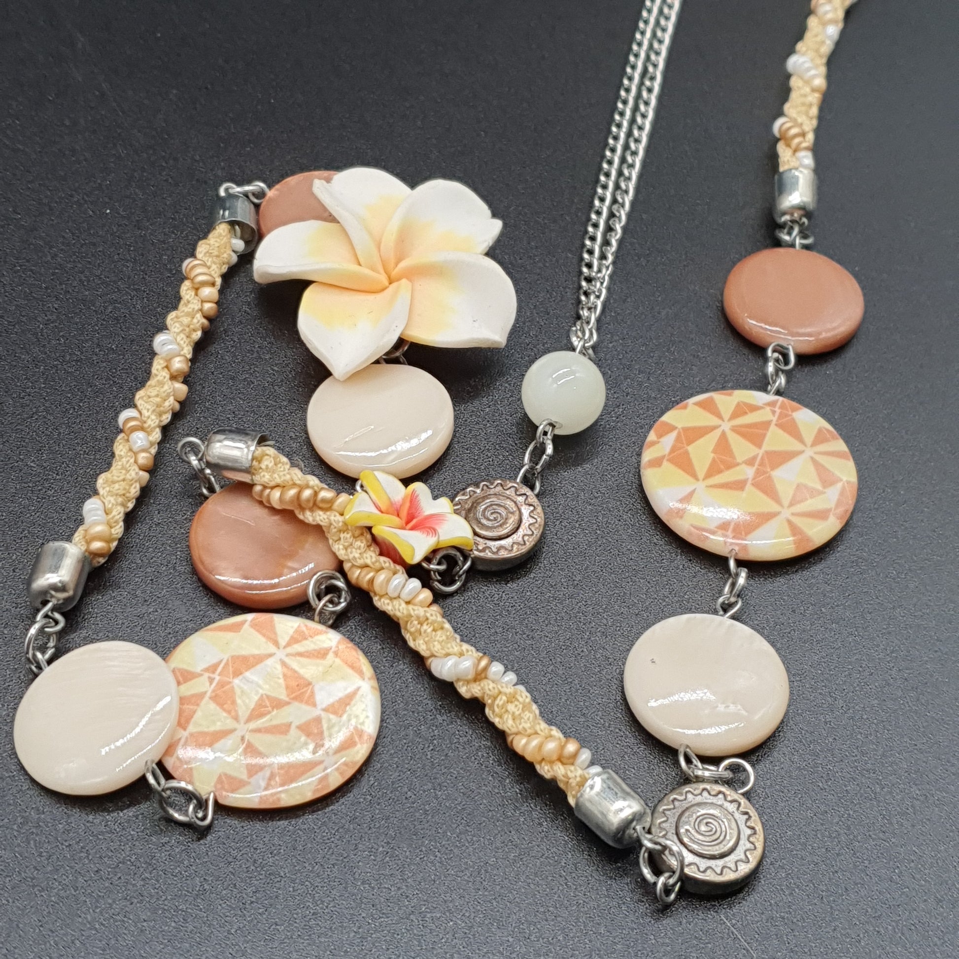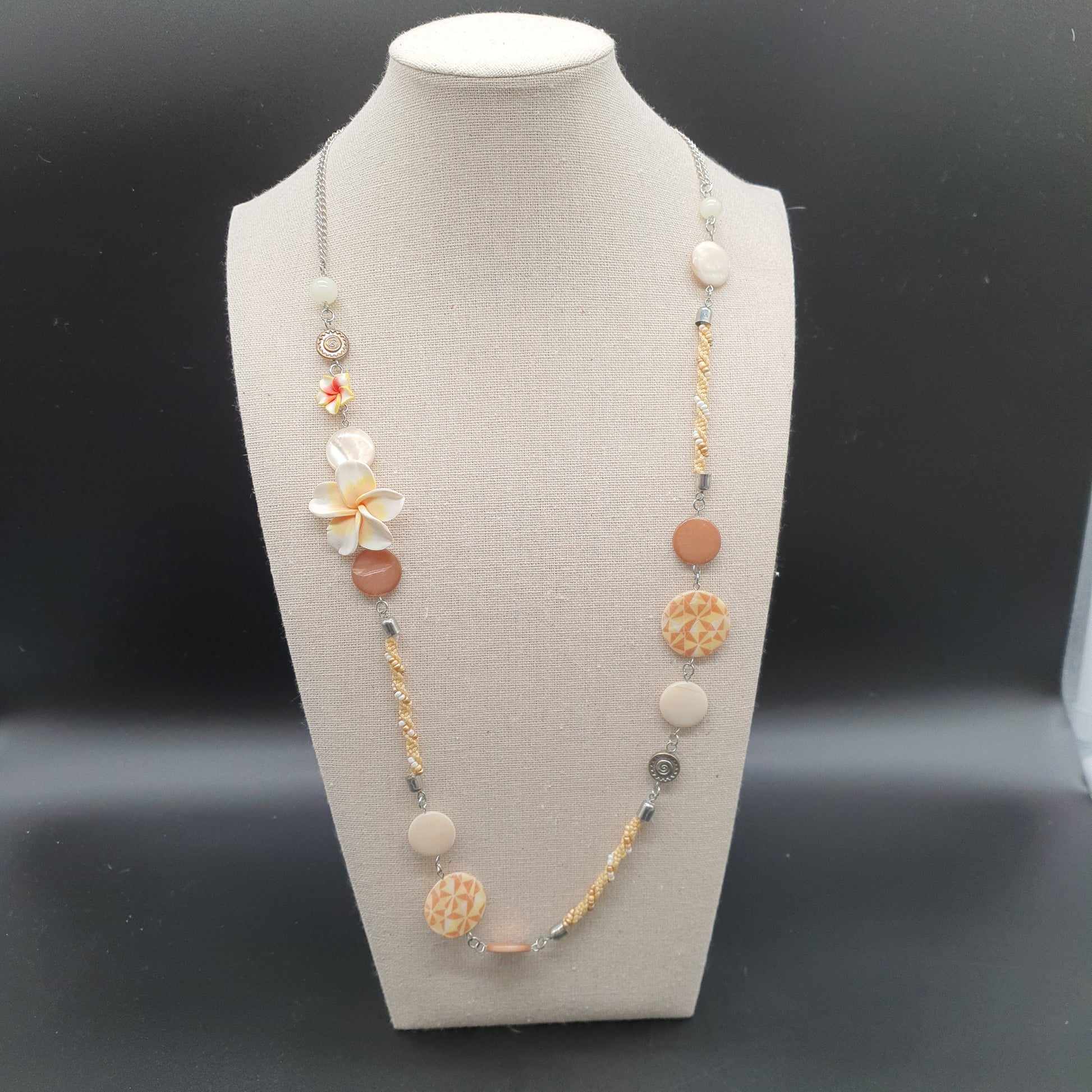 Cette parure raffinée se compose d’un collier sautoir à double chaîne argentée en maille gourmette, orné de perles de rocaille torsadées, perles naturelles d’eau douce, disques colorés effet nacré, pièces en métal travaillé et de fleurs en polymère façon tiaré 🌺