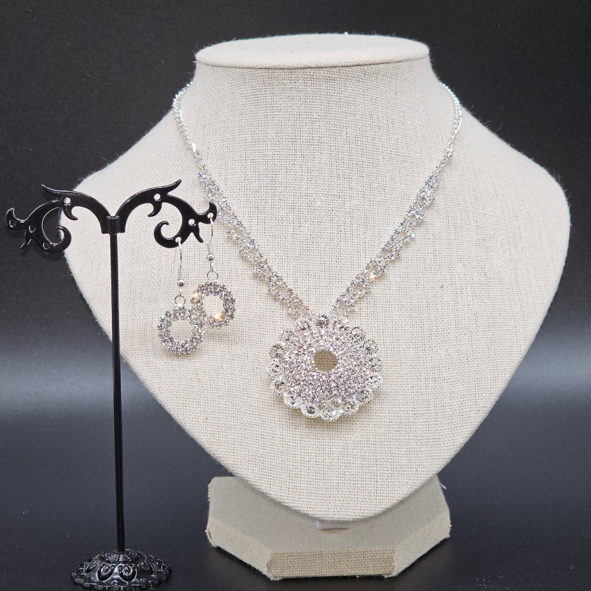 Brillez de mille feux avec cette parure scintillante composée d’un collier à pendentif en strass et d’une paire de boucles d’oreilles assorties.