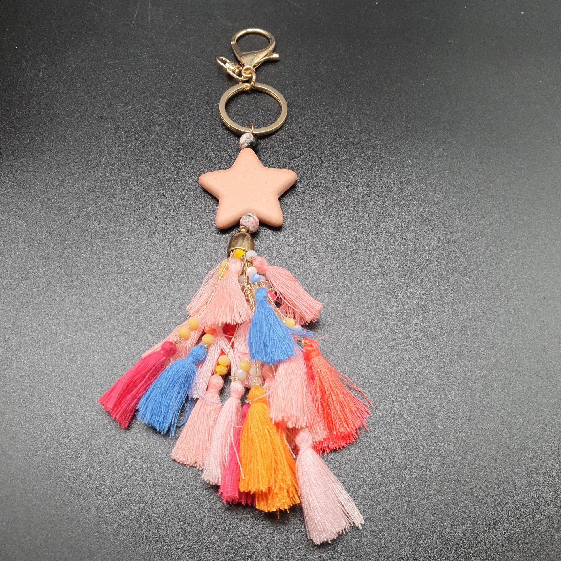 Bijou de sac porte clés style bohème étoile colorée perles pierre effet marbré pompons tassel multicolores fils de polyester perles fantaisie