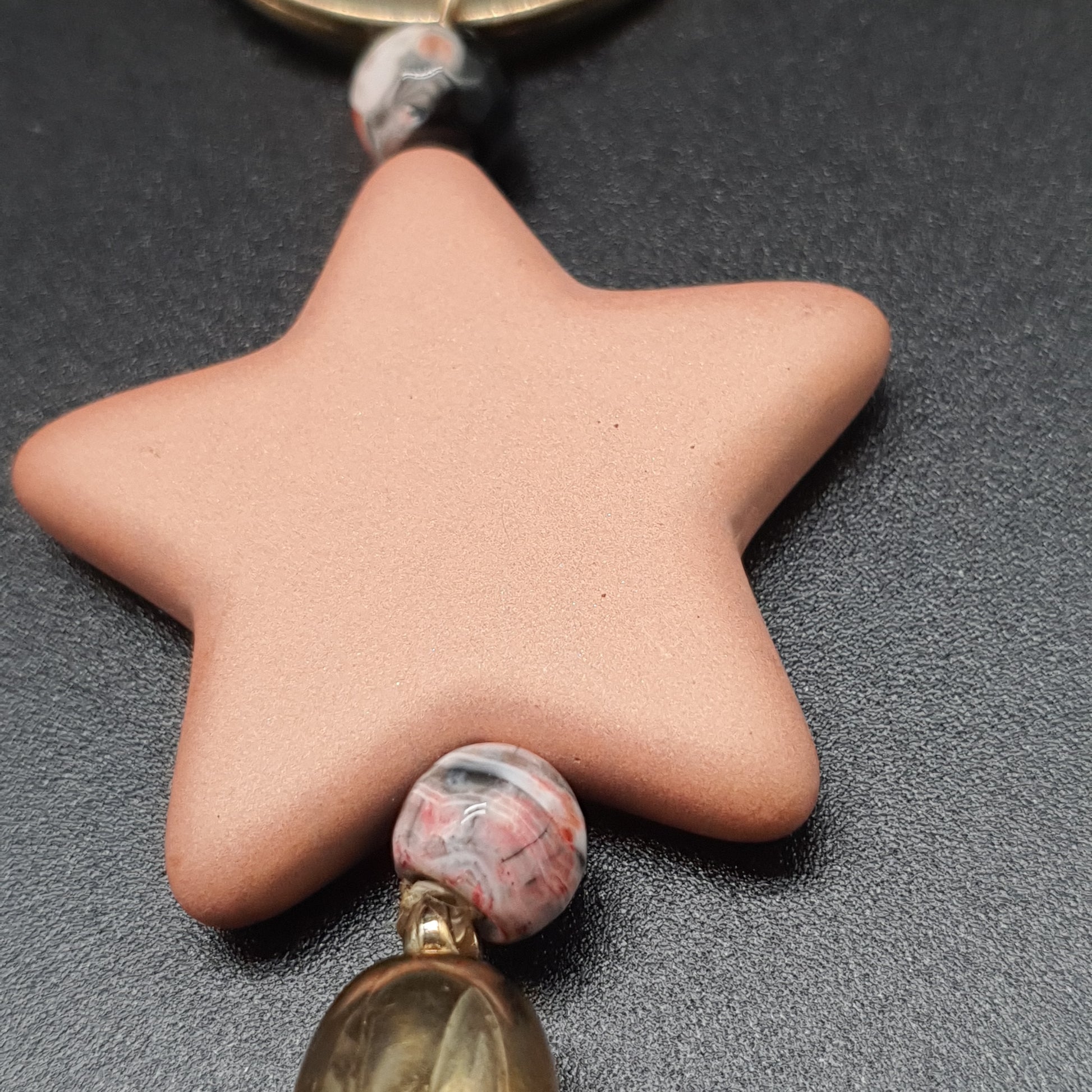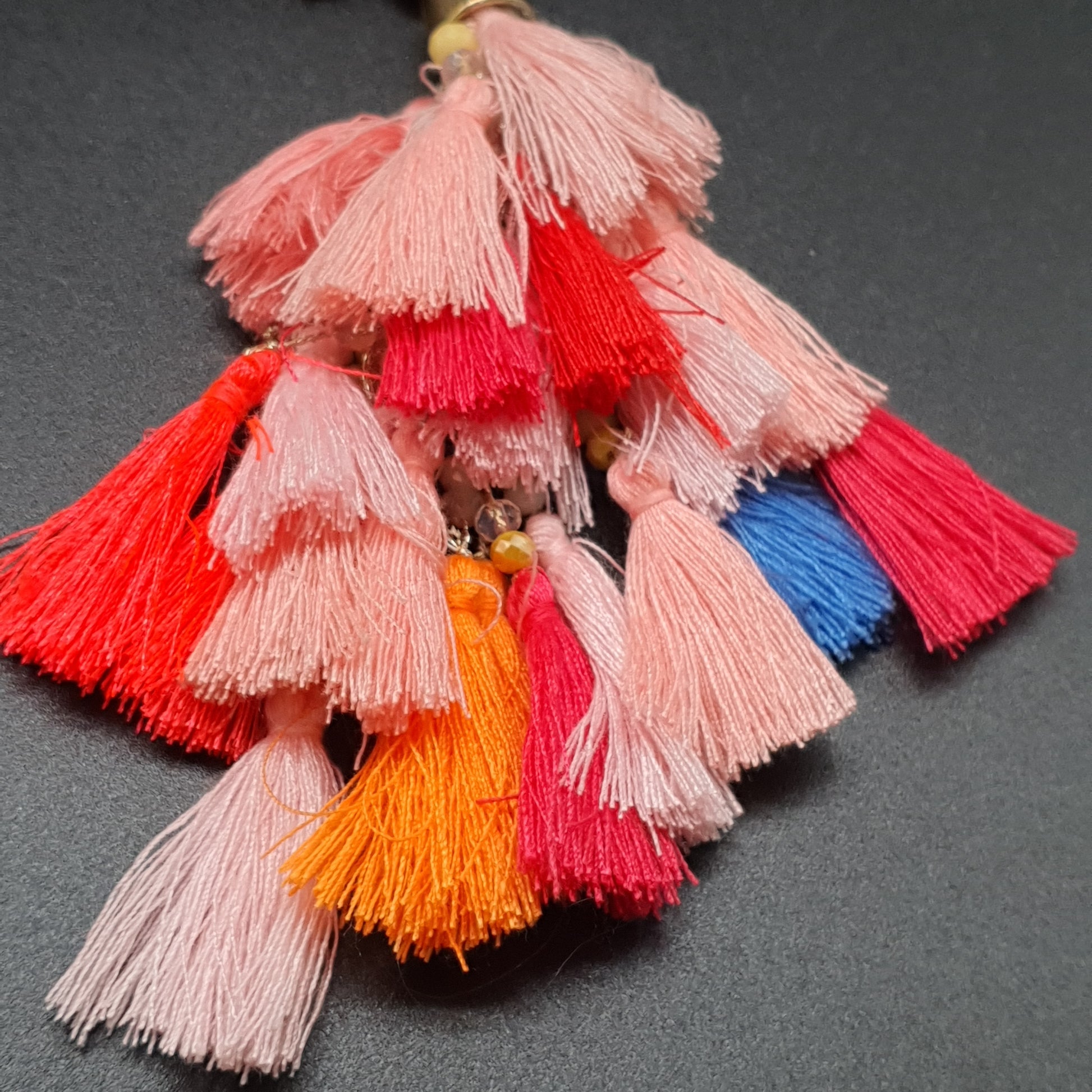Bijou de sac - porte clés de style bohème composé d'une étoile colorée en ?????? agrémentée de perles en pierre effet marbré et de pompons tassel multicolores en fils de polyester et perles fantaisie.