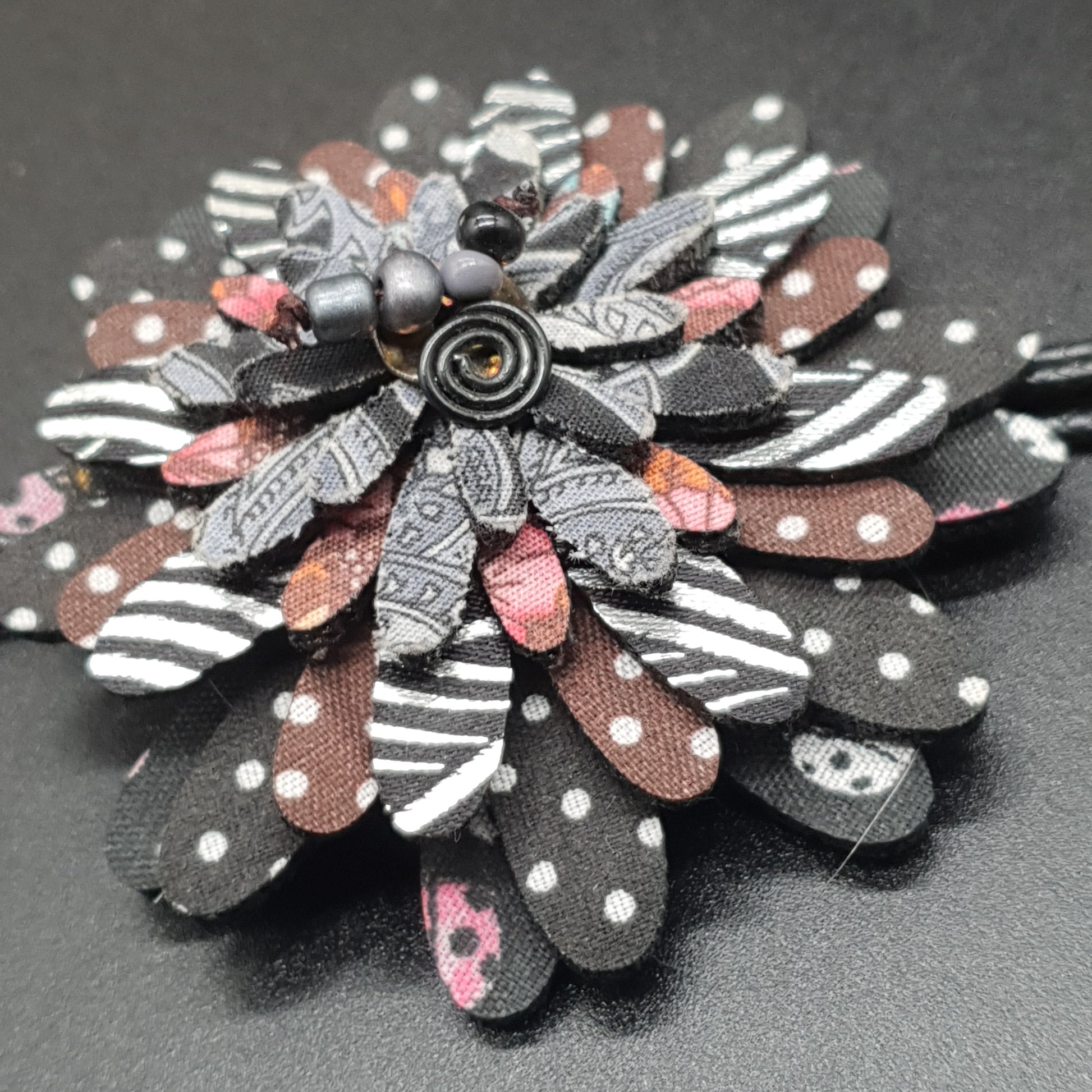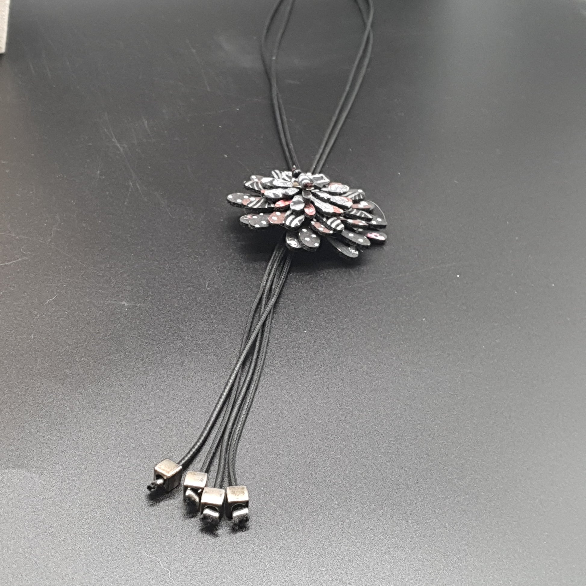 Collier sautoir double cordon coton ciré fleur pétales tissus perles cubes métal Collier sautoir fleur tissu pétales perles cubes métal argenté – double cordon coton ciré noir