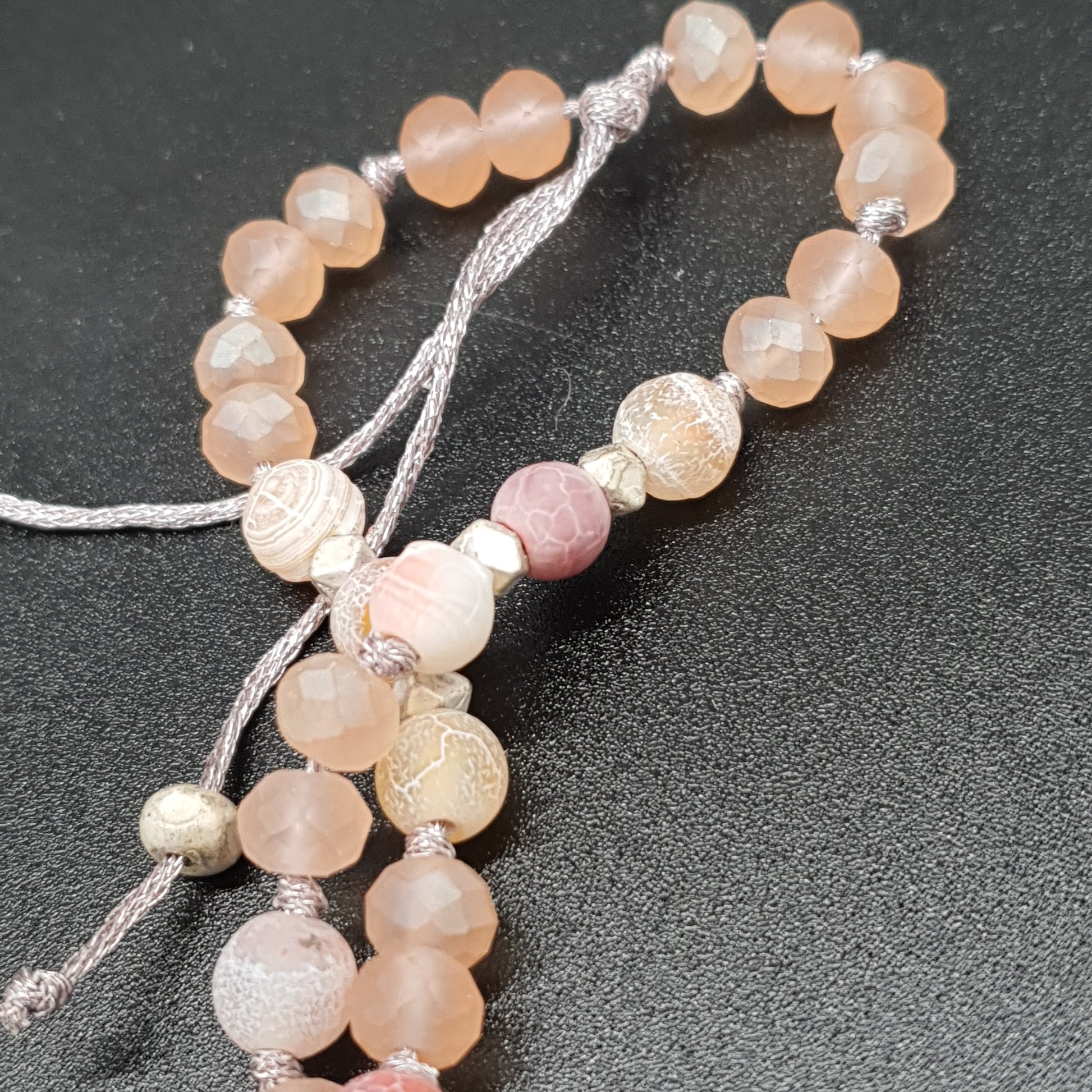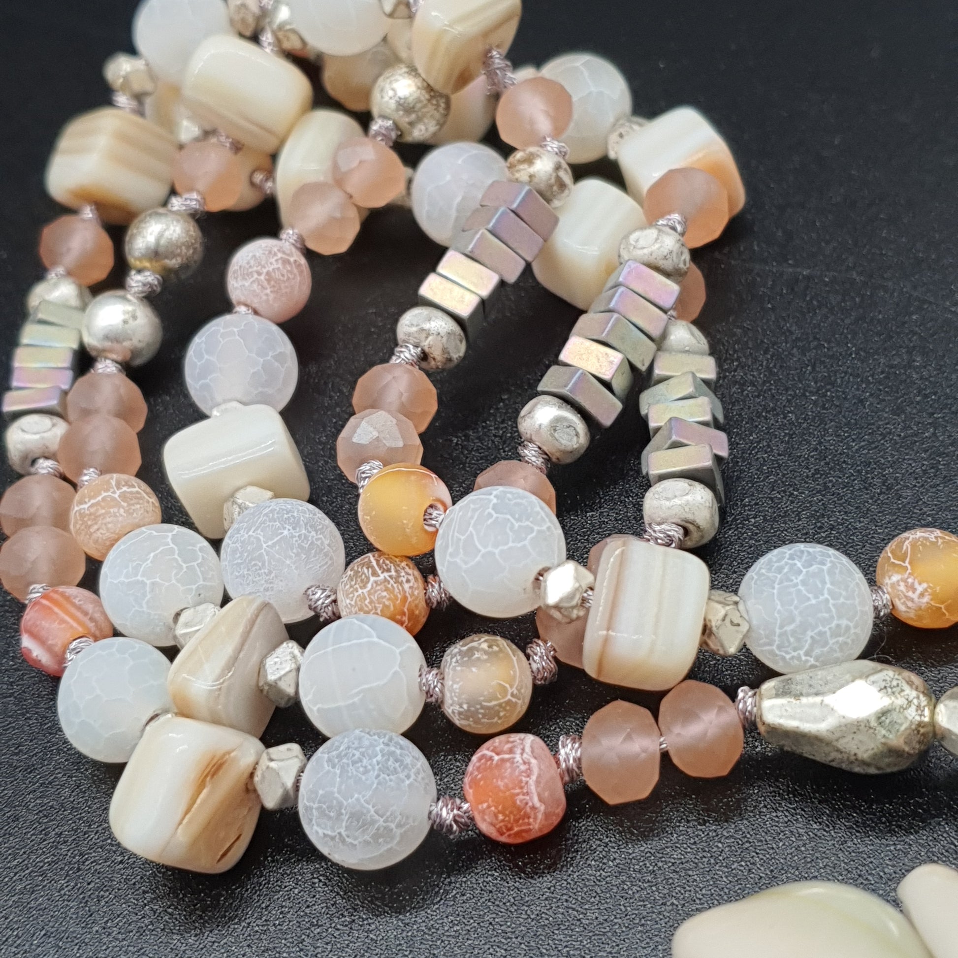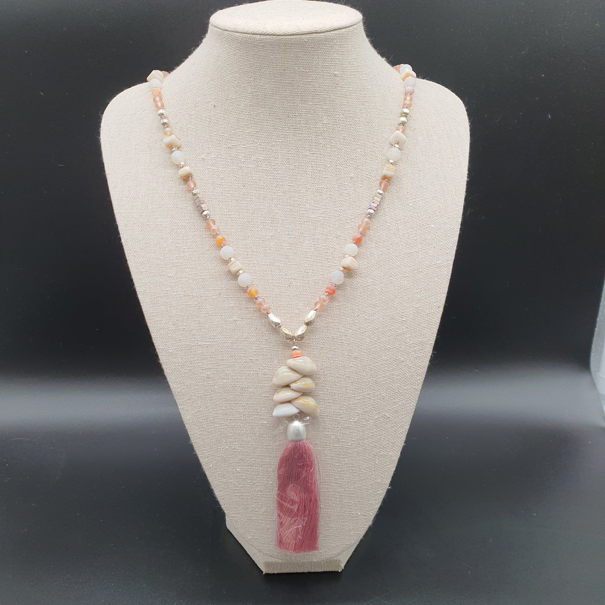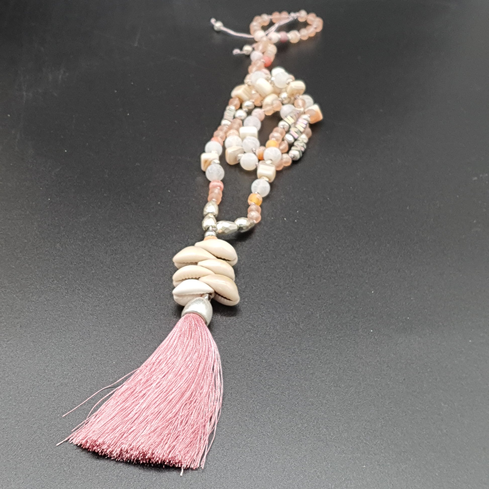 Collier sautoir perles pierre reconstituée éclat de cristal effet marbré eau douce métal doré vieilli pendentif coquillages cauri pompon tassel fils de coton